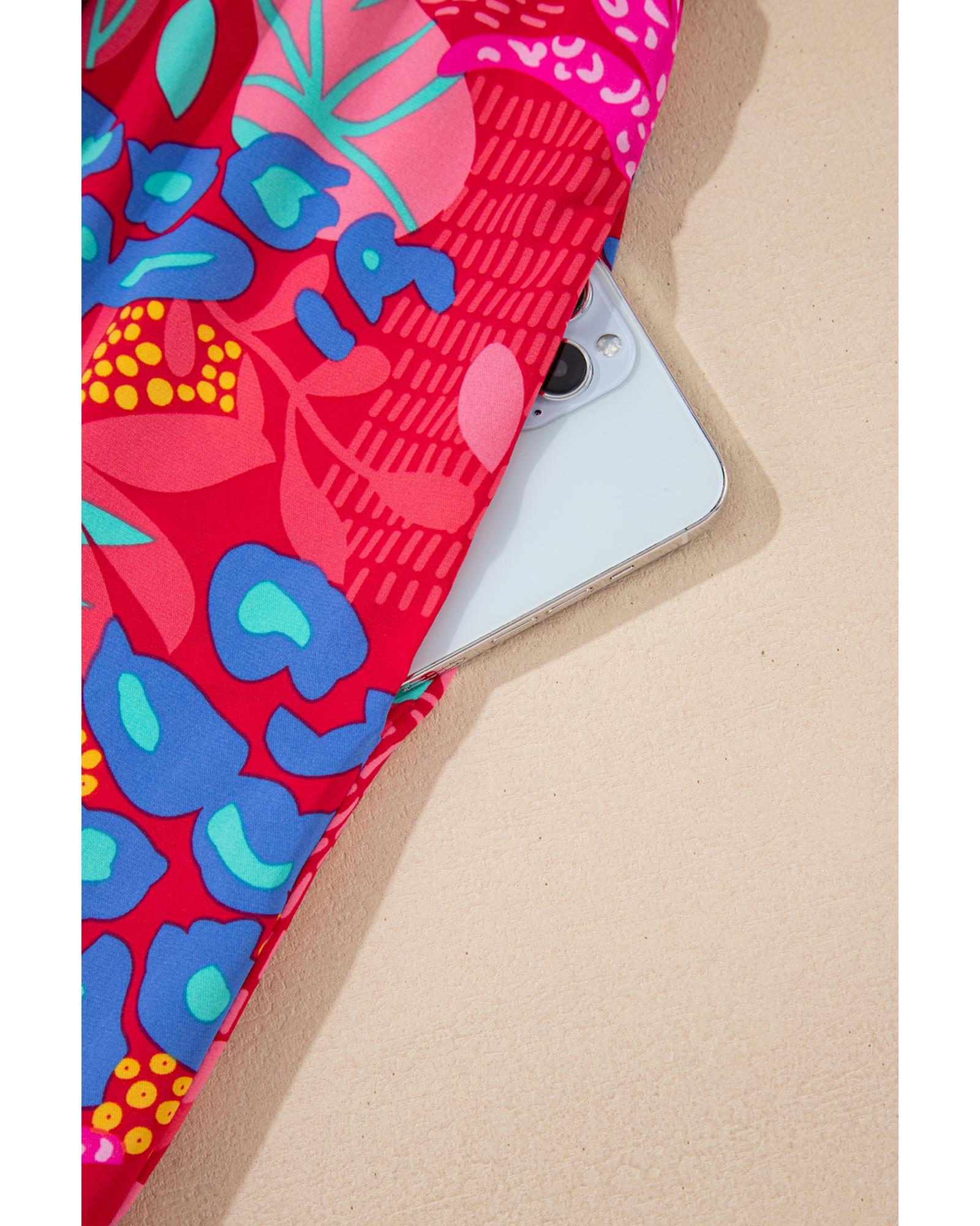 Rose Tropical Printed Lantern Sleeve V Neck Ruffled Plus Size Mini Dress – 4X