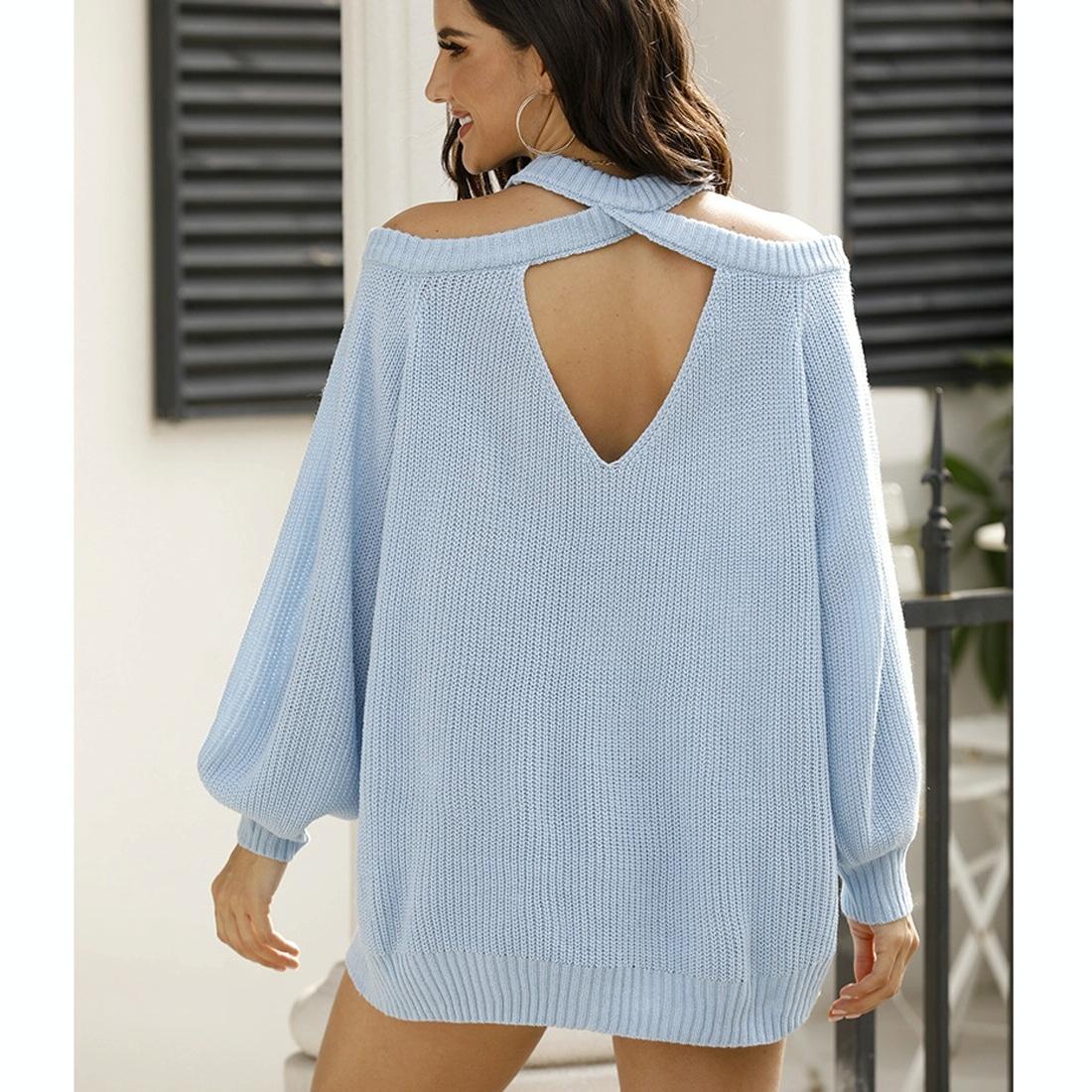 Round-Neck Strapless Heart Hollowing Knit Sweater – Blue M