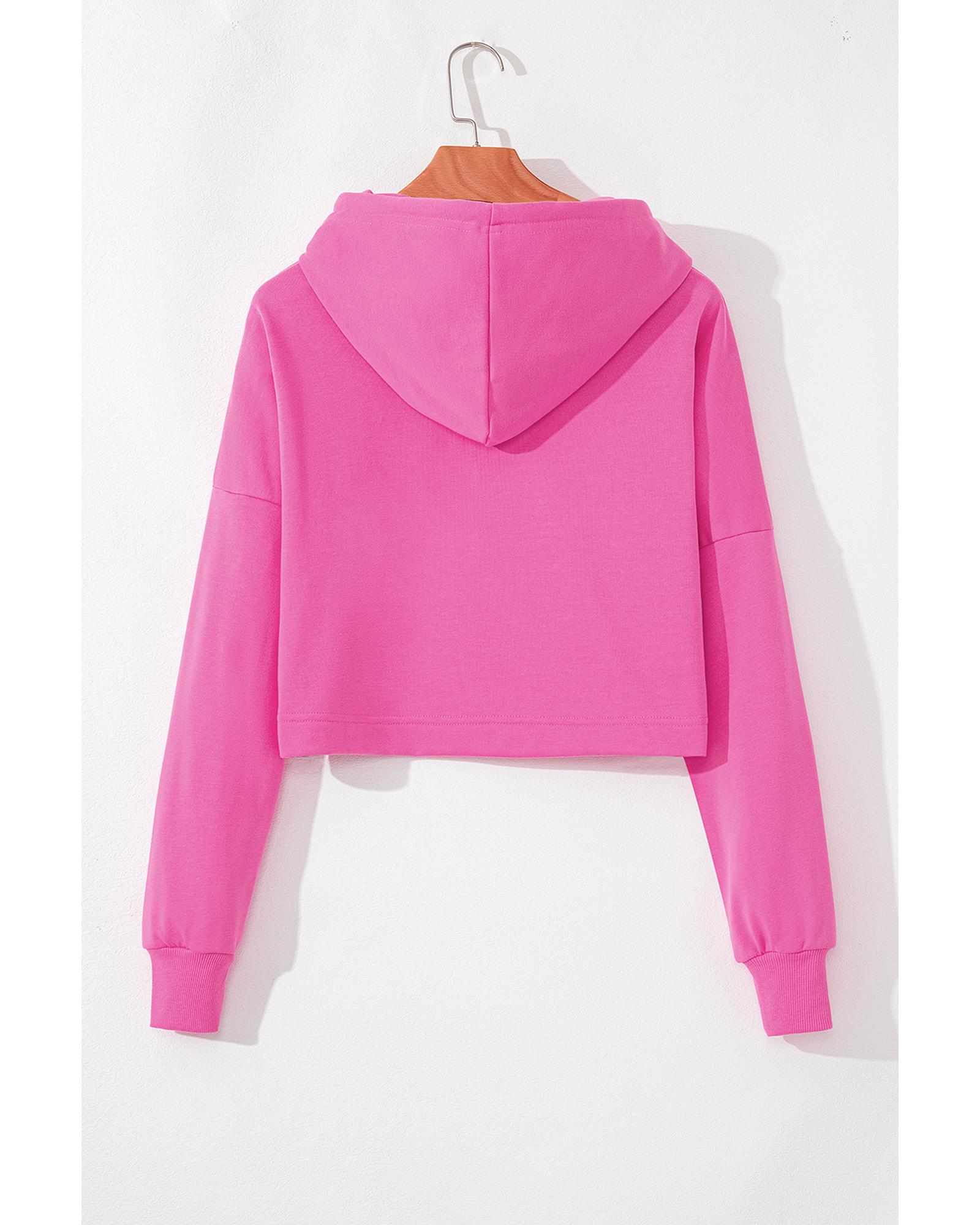 • Sachet Pink Solid Drop Shoulder Drawstring Cropped Hoodie