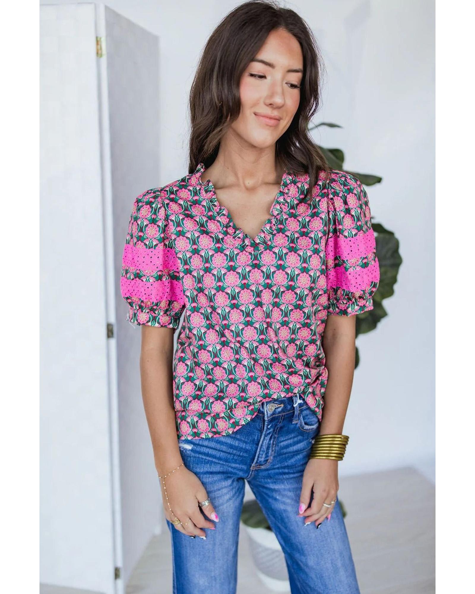 - Neck Ruffle Abstract Floral Print Puff Sleeve Top