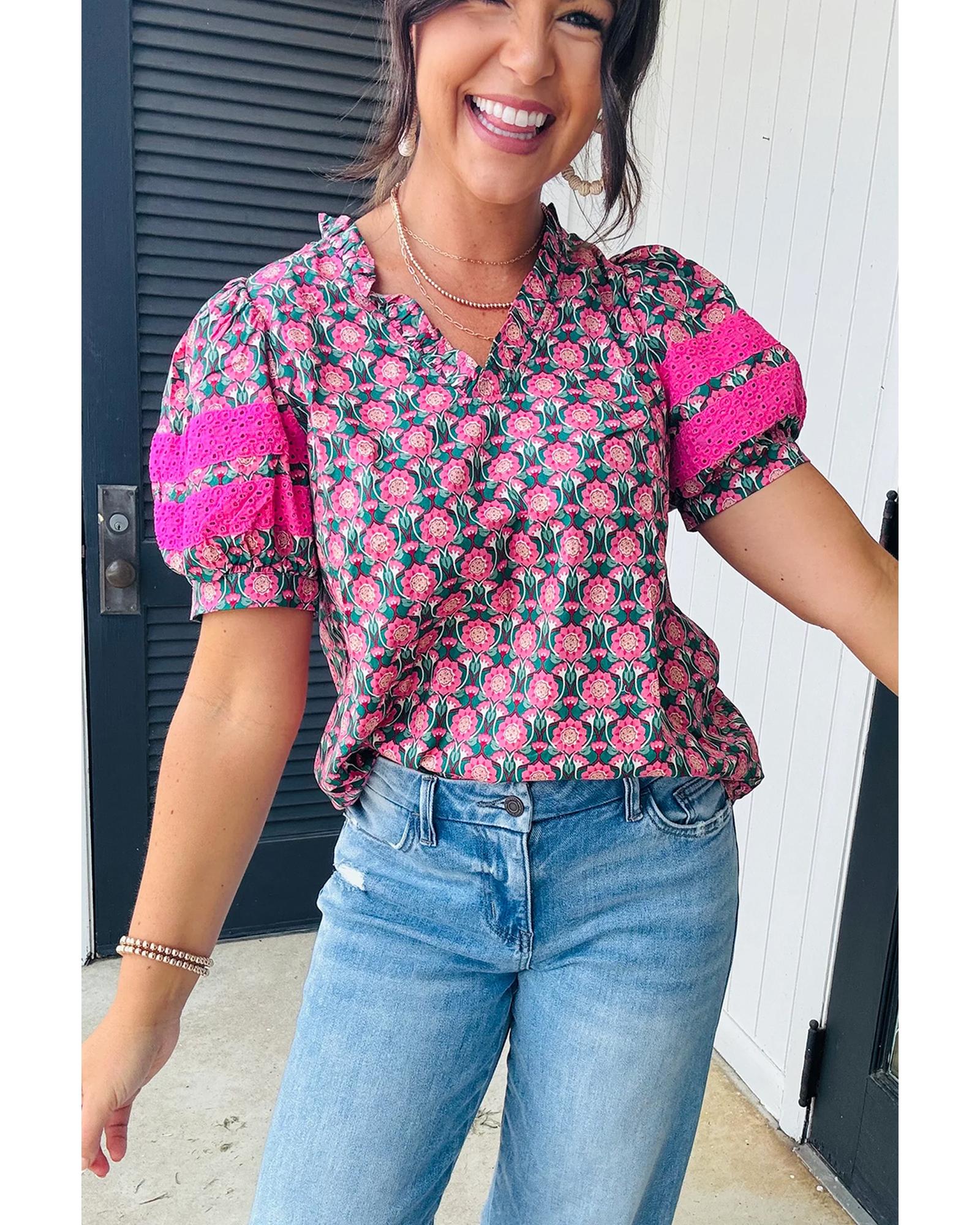 - Neck Ruffle Abstract Floral Print Puff Sleeve Top