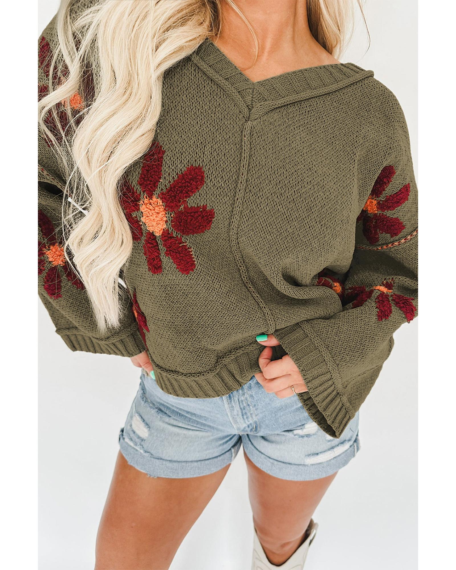 Sage Green Flower Knit Ribbed Trim V Neck Sweater – XL