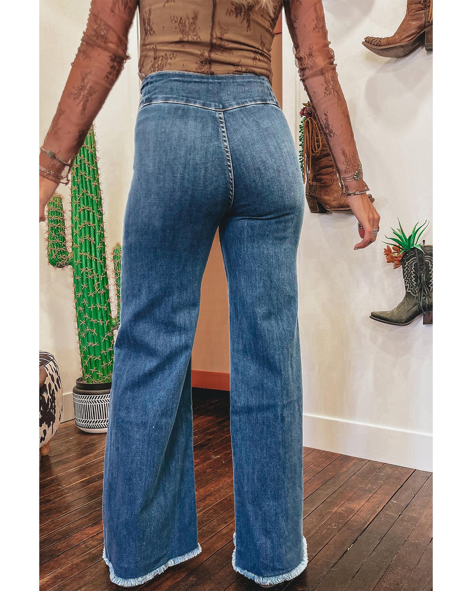 Sail Blue High Waist Button Fly Seamed Raw Hem Flare Jeans – 14 US