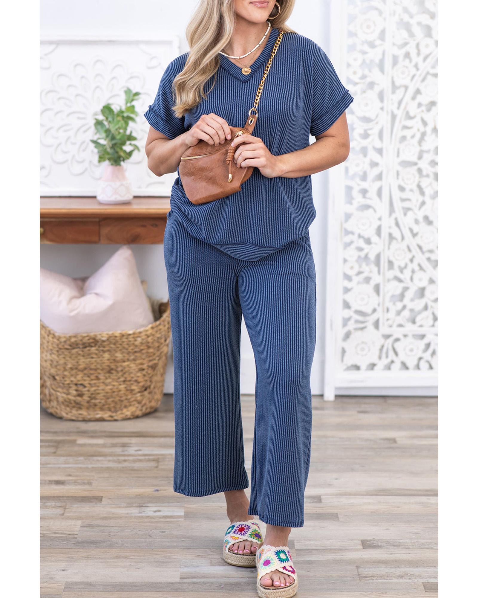Sail Blue Ribbed V Neck Tee and Pants Plus Size Set – 4X
