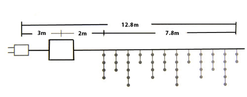 - Total Length: 12.8m: Lighted length 7.8m; light to controller 2m; controller to Power adaptor 3m