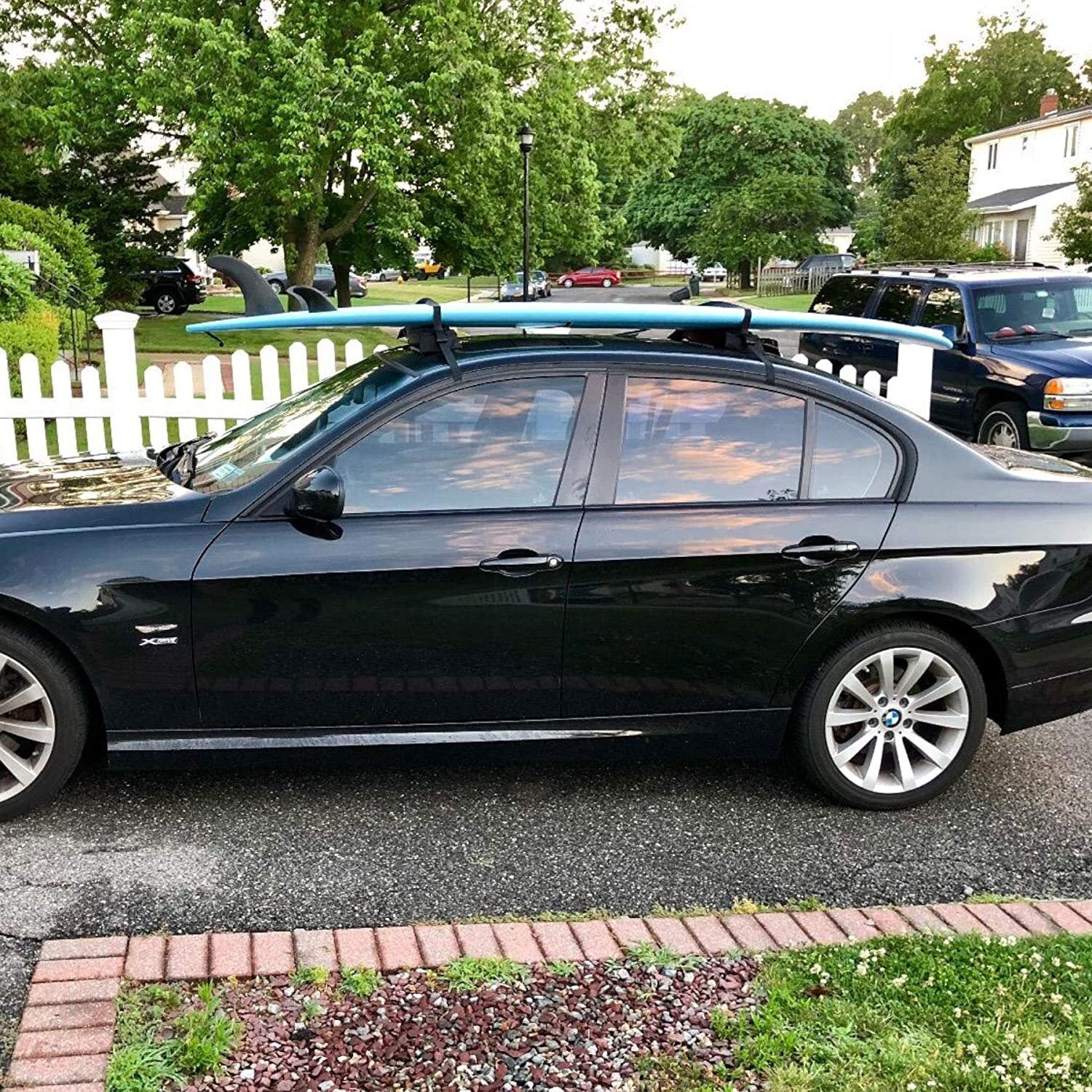 Universal fits cars and SUVs w/no roof racks, straps to and tightens around your roof, and around your kayak or surfboards