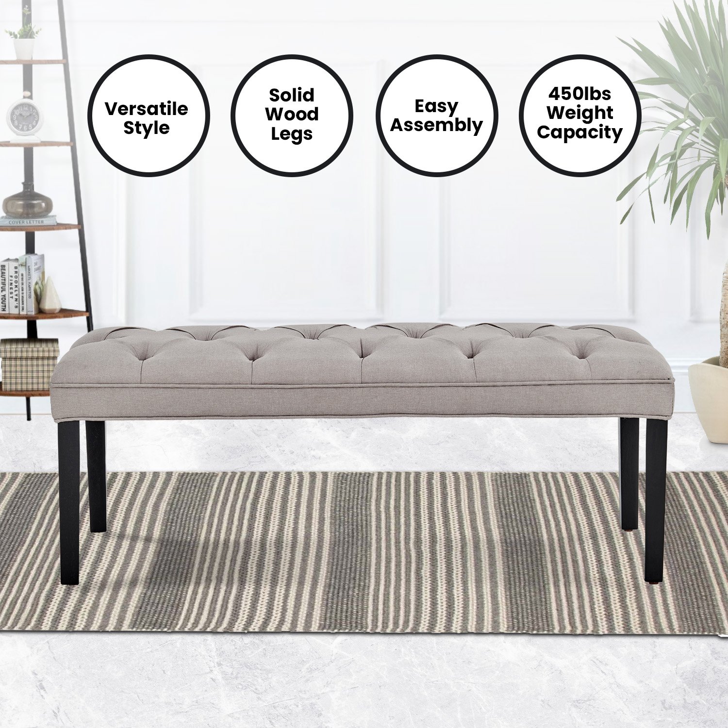 The button-tufted upholstery is made with breathable linen and sits on top of solid wooden legs for superior durability. This bench measures 123cm wide and offers generous seating for you and your guests. Choose from three fabulous shades to complement your existing home decor!