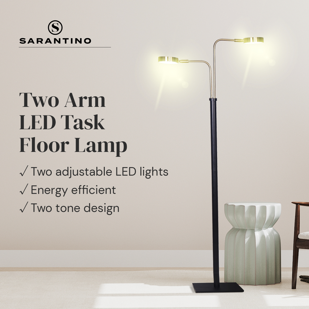 Sarantino LED Metal Floor Lamp with 2 Lights in Brushed Gold and Black Finish