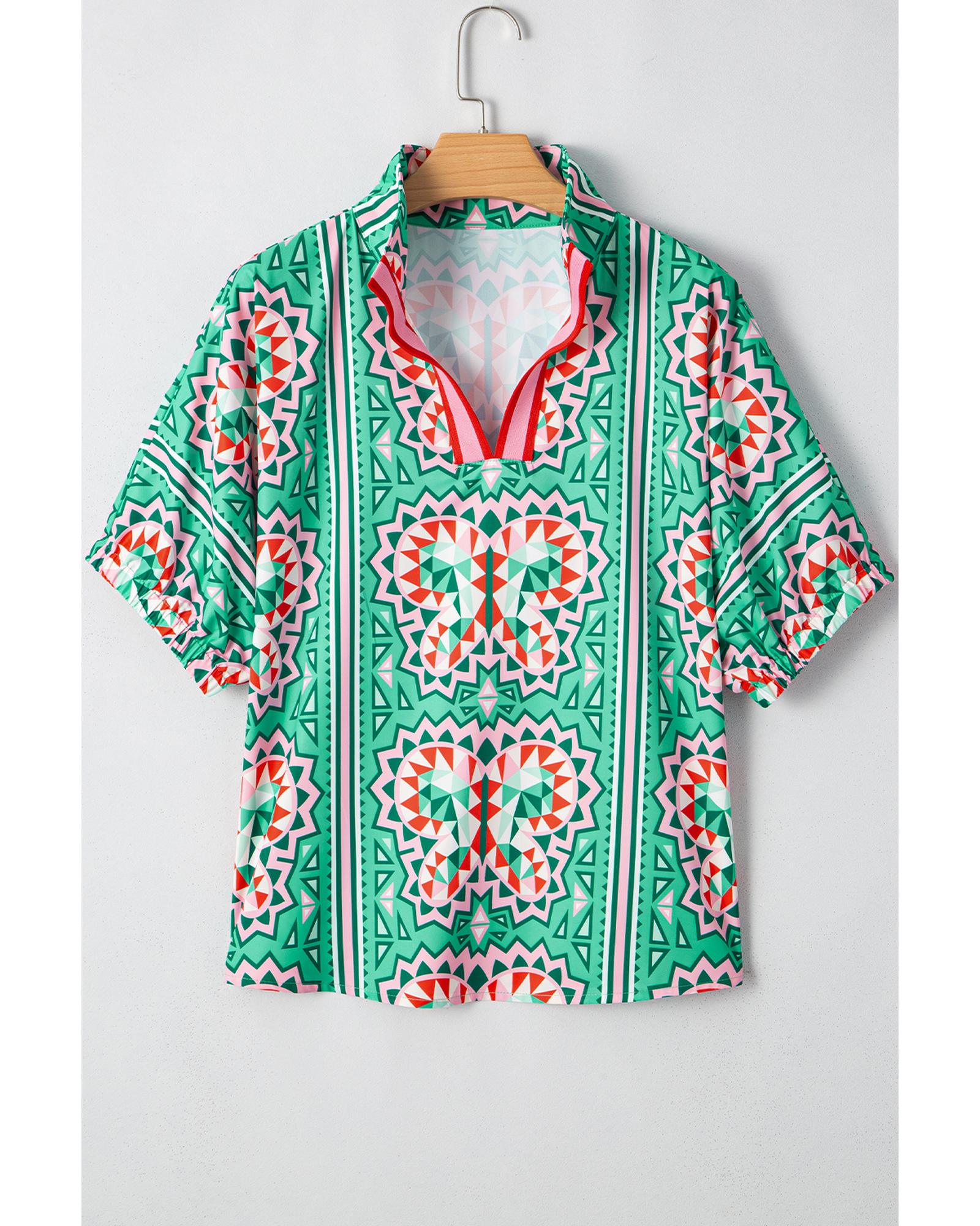 Sea Green Boho Abstract Print Contrast Striped Collared V Neck Blouse – S