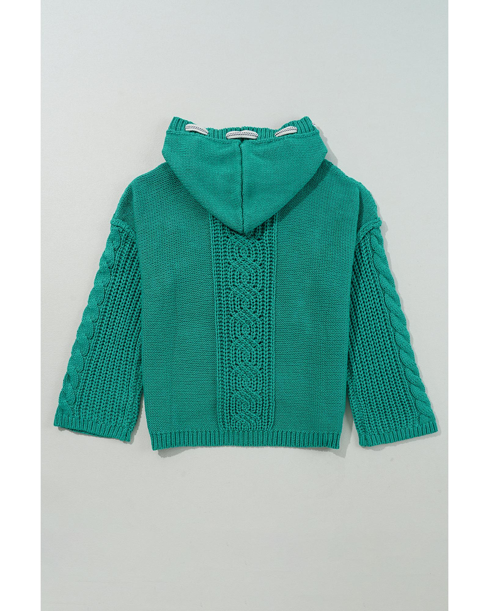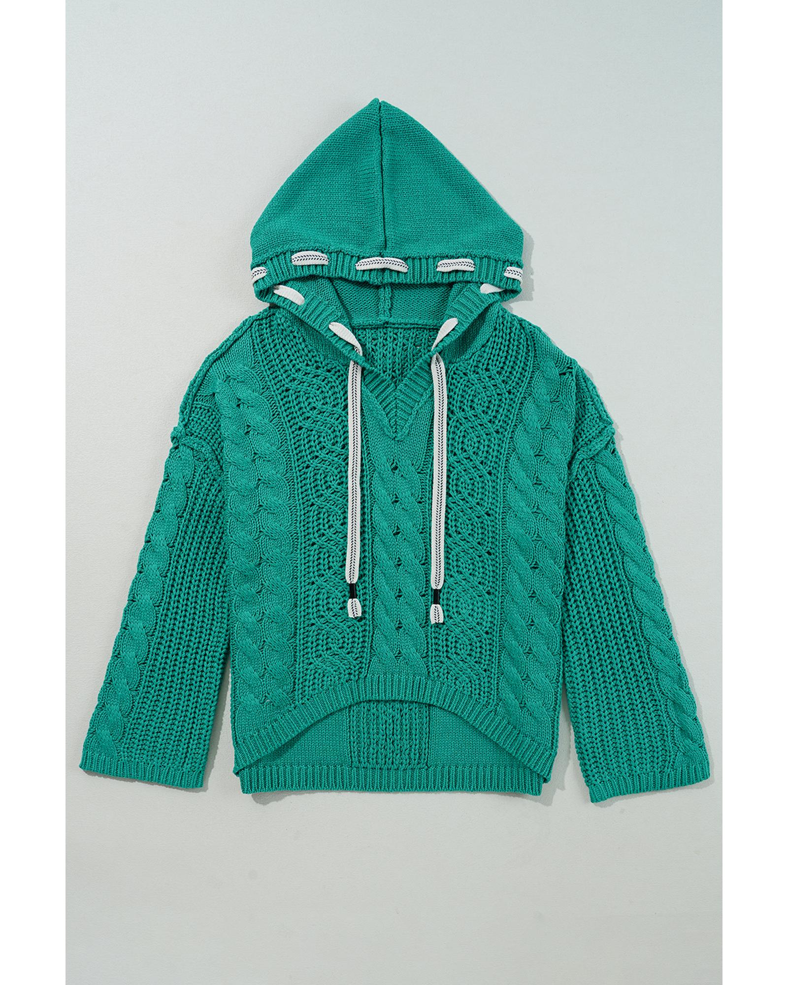 - Sea Green Cable Knit V Neck Contrast Drawstring Hooded Sweater