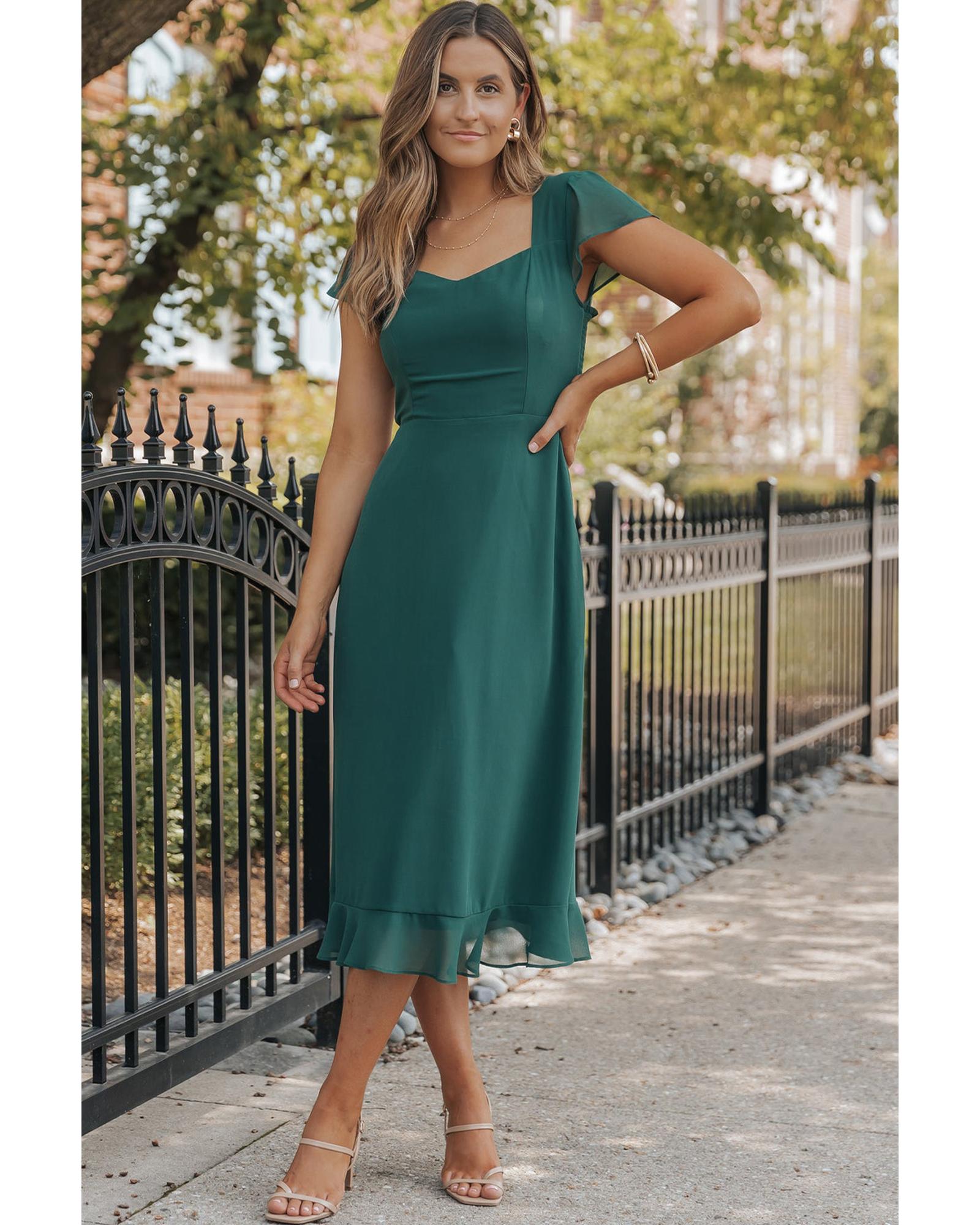 Sea Green Shirred Open Back Sweetheart Neck Ruffled Midi Dress – M