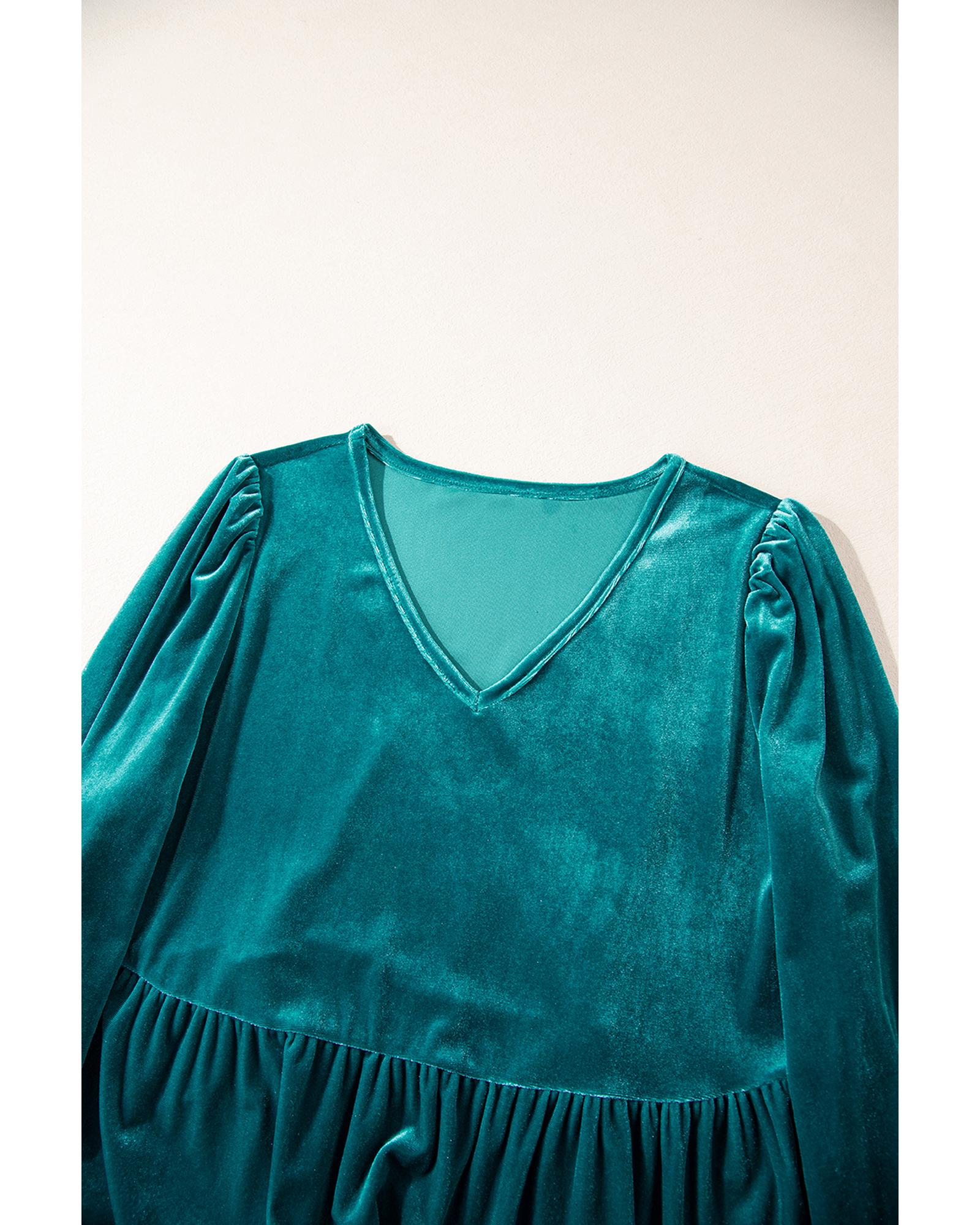 Sea Green Velvet V Neck Peplum Hem Puff Sleeve Blouse – S