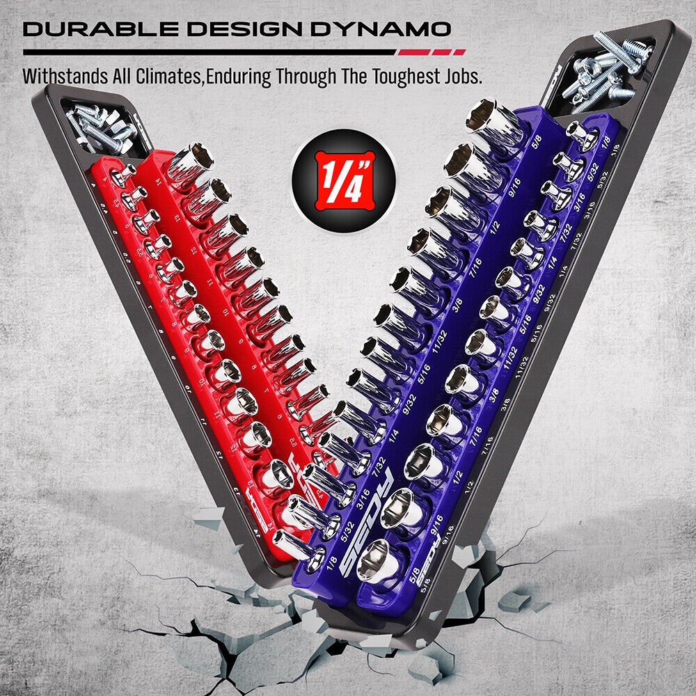 - MAGNETIC GRIP– Ensure your 1/4-inch sockets remain securely in place, whether in a drawer, toolbox, or mounted on a tool cart with our magnetic socket organizer set.