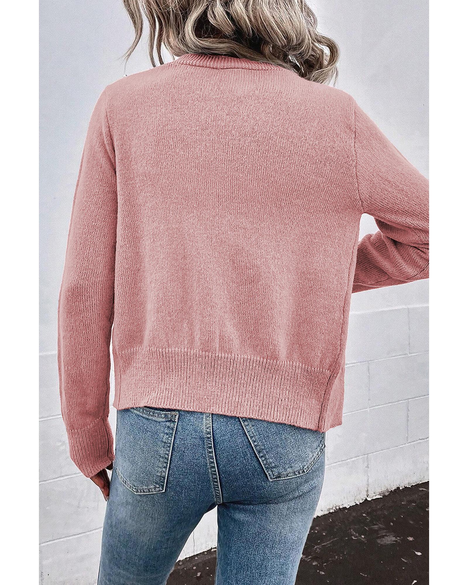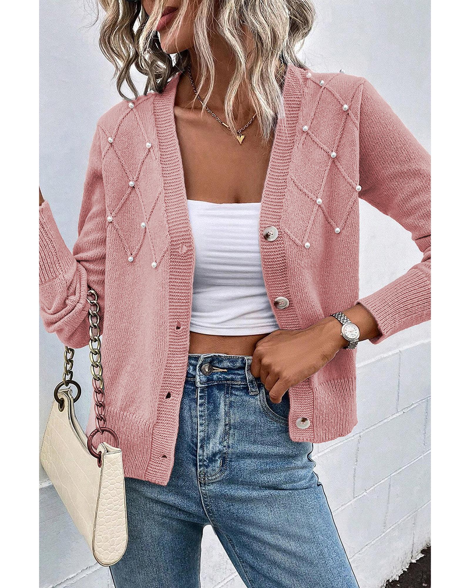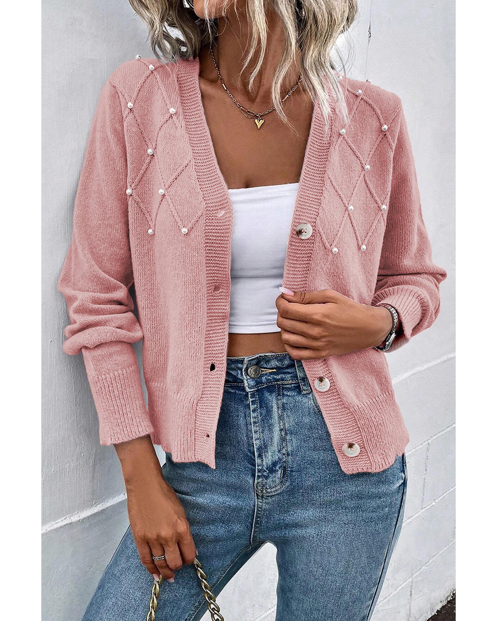 - Sepia Rose Textured Knit Pearl Beaded Button Up Cardigan