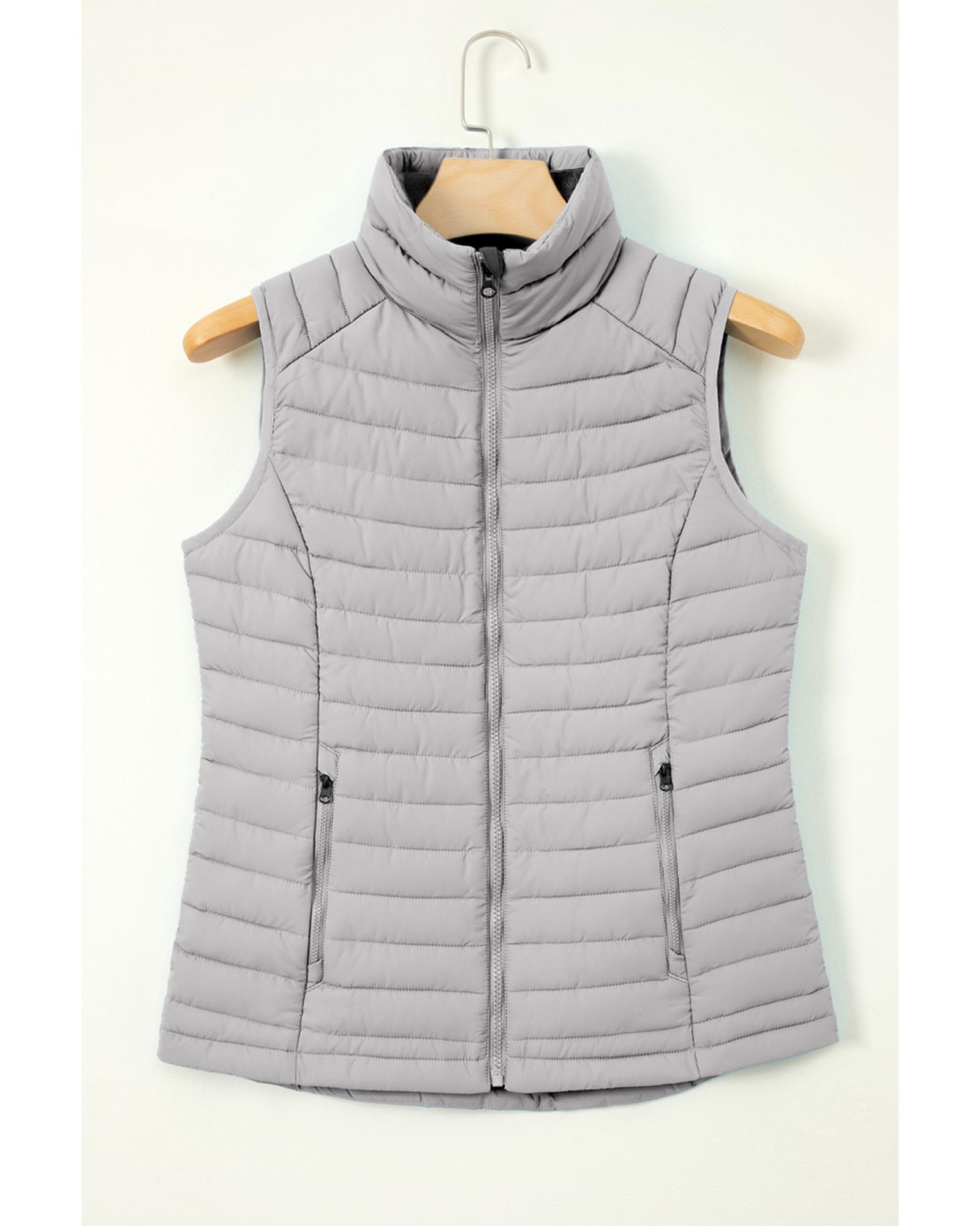 Silvery Plush Collared Quilted Zipped Puffer Vest - S