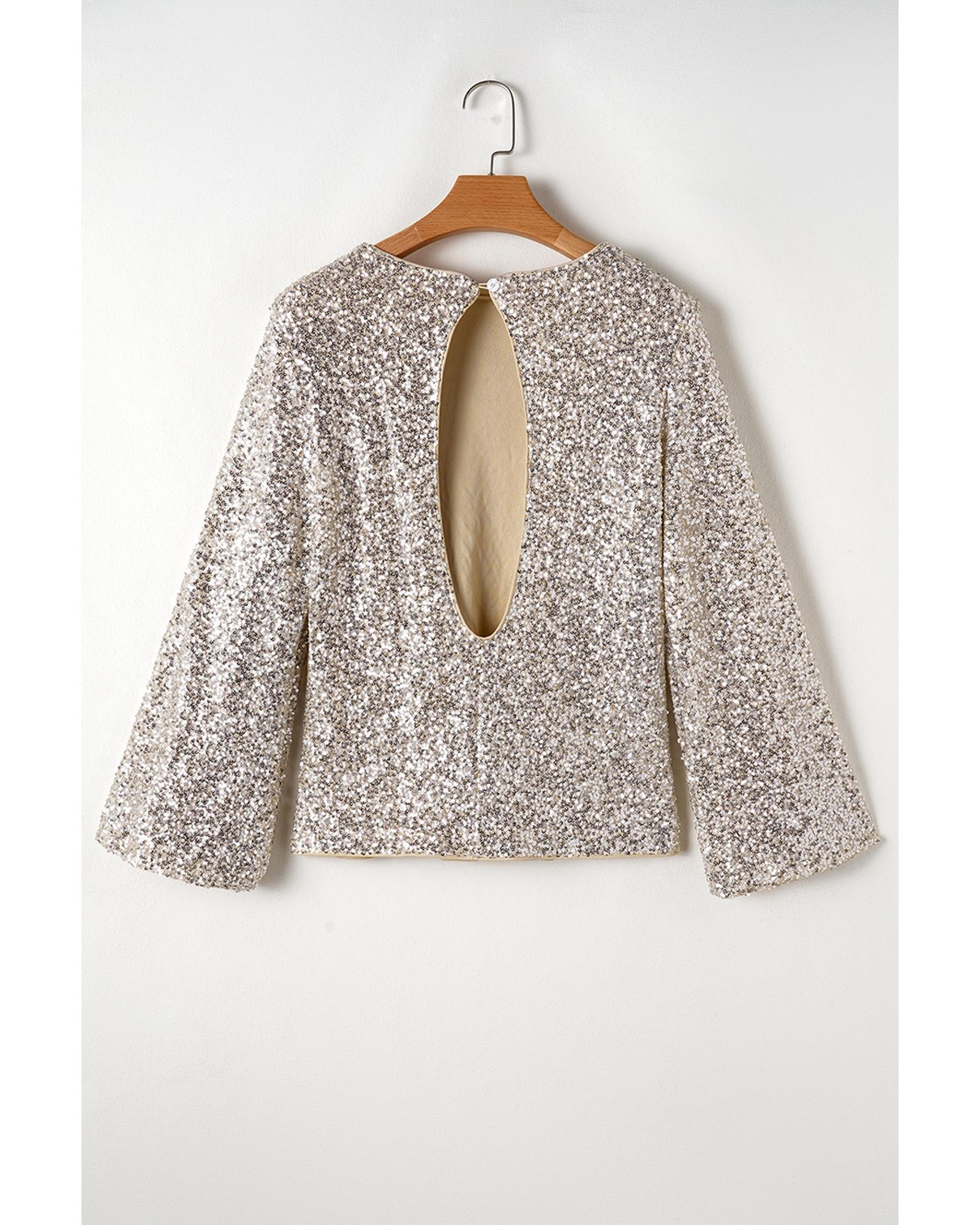 Silvery Sequin Puff Sleeve Cutout Back Blouse – M