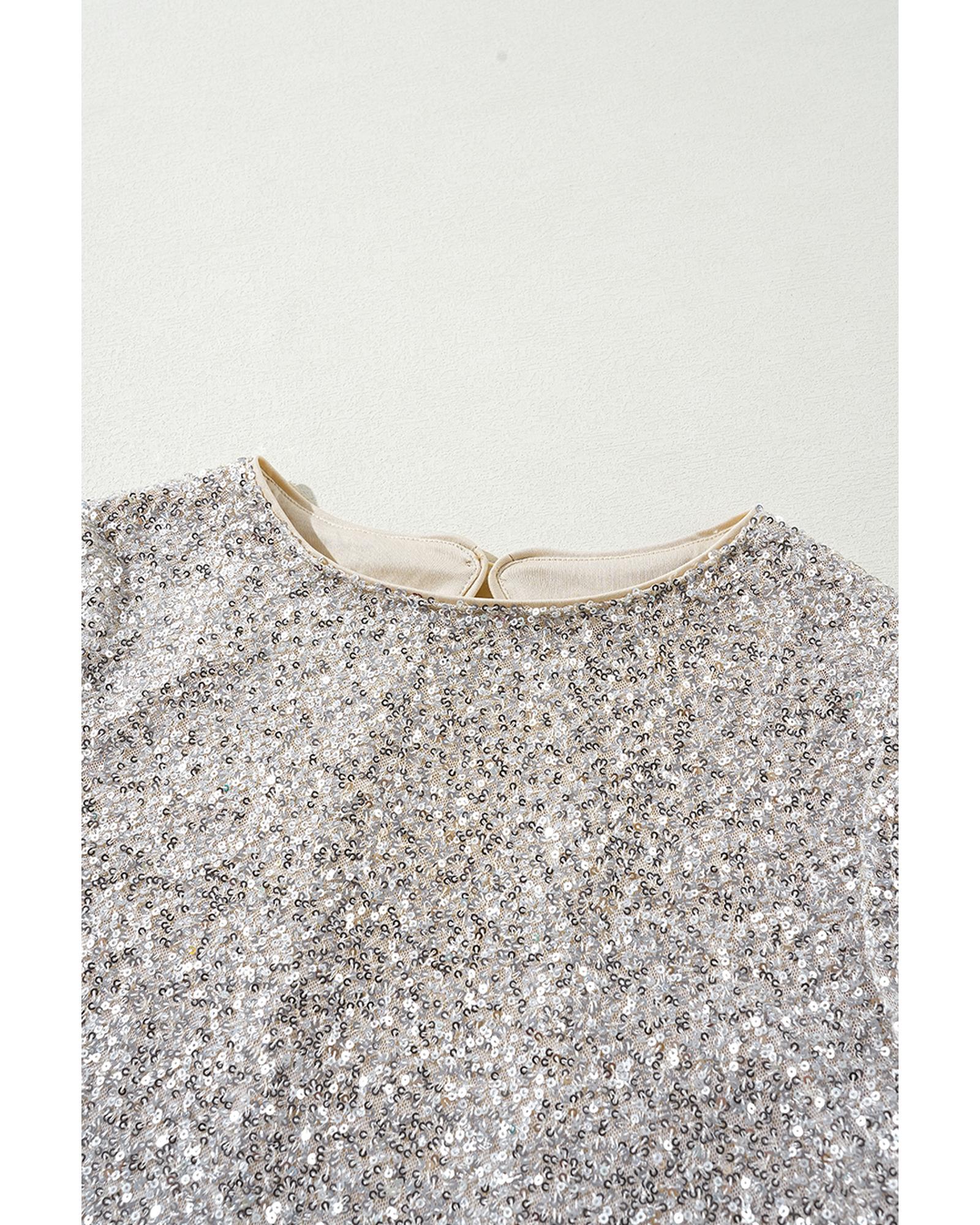 Silvery Sequin Puff Sleeve Cutout Back Blouse – XL