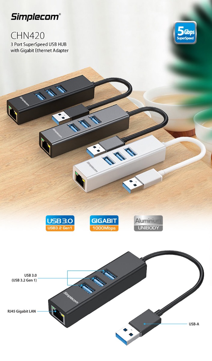 Simplecom CHN420 Aluminium 3 Port SuperSpeed USB HUB with Gigabit Ethernet Adapter Silver