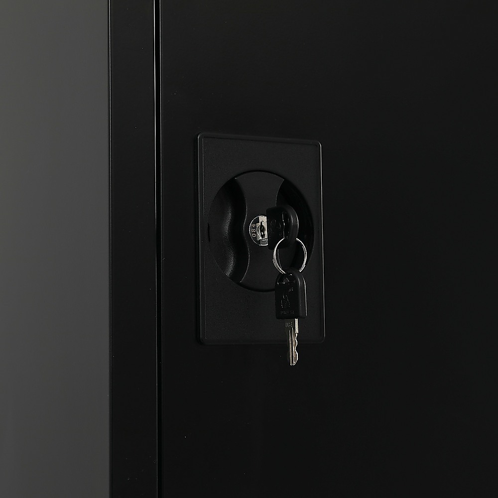 The steel material has a thickness of 0.6mm. The bottom panel is designed with side and central reinforcement, hidden metal hinges and galvanized screws. It has a concealed security lock and adjustable legs for greater stability.