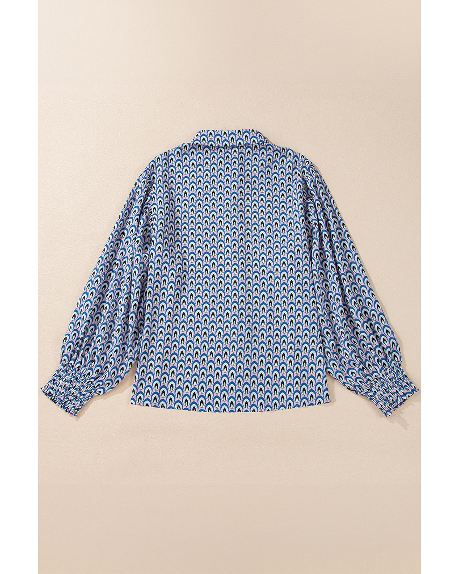 Sky Blue Abstract Print Shirred Cuff Buttoned Oversized Shirt – S