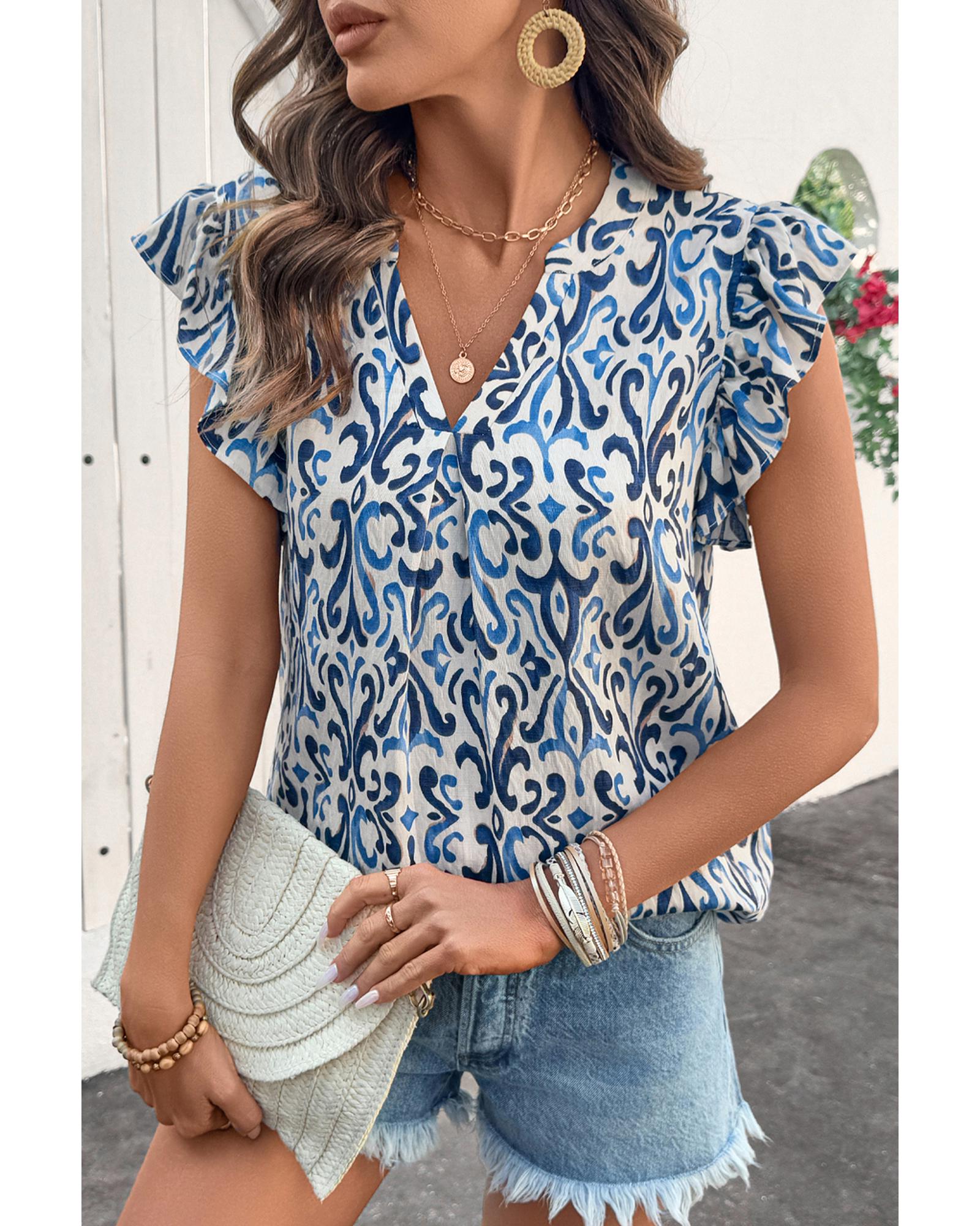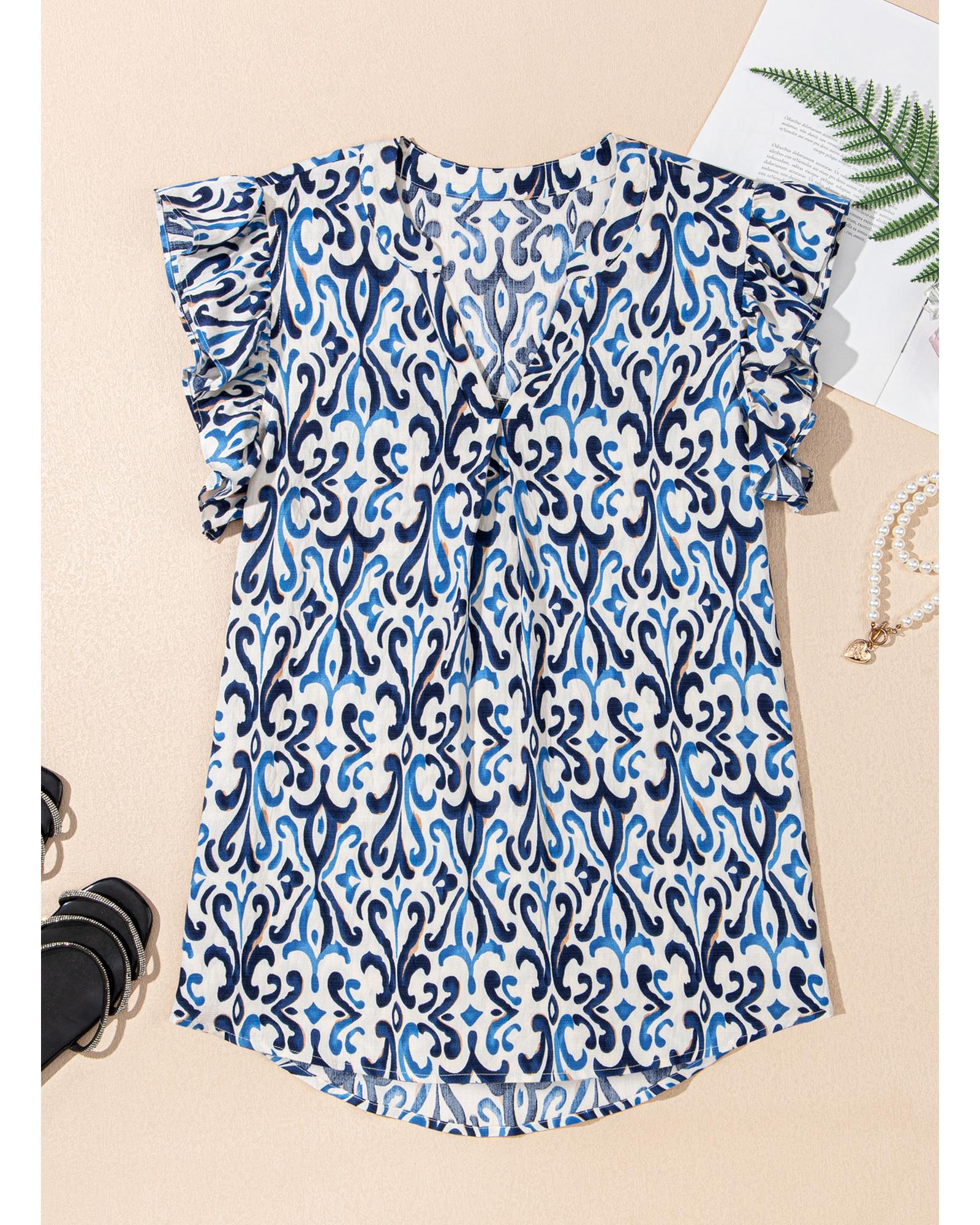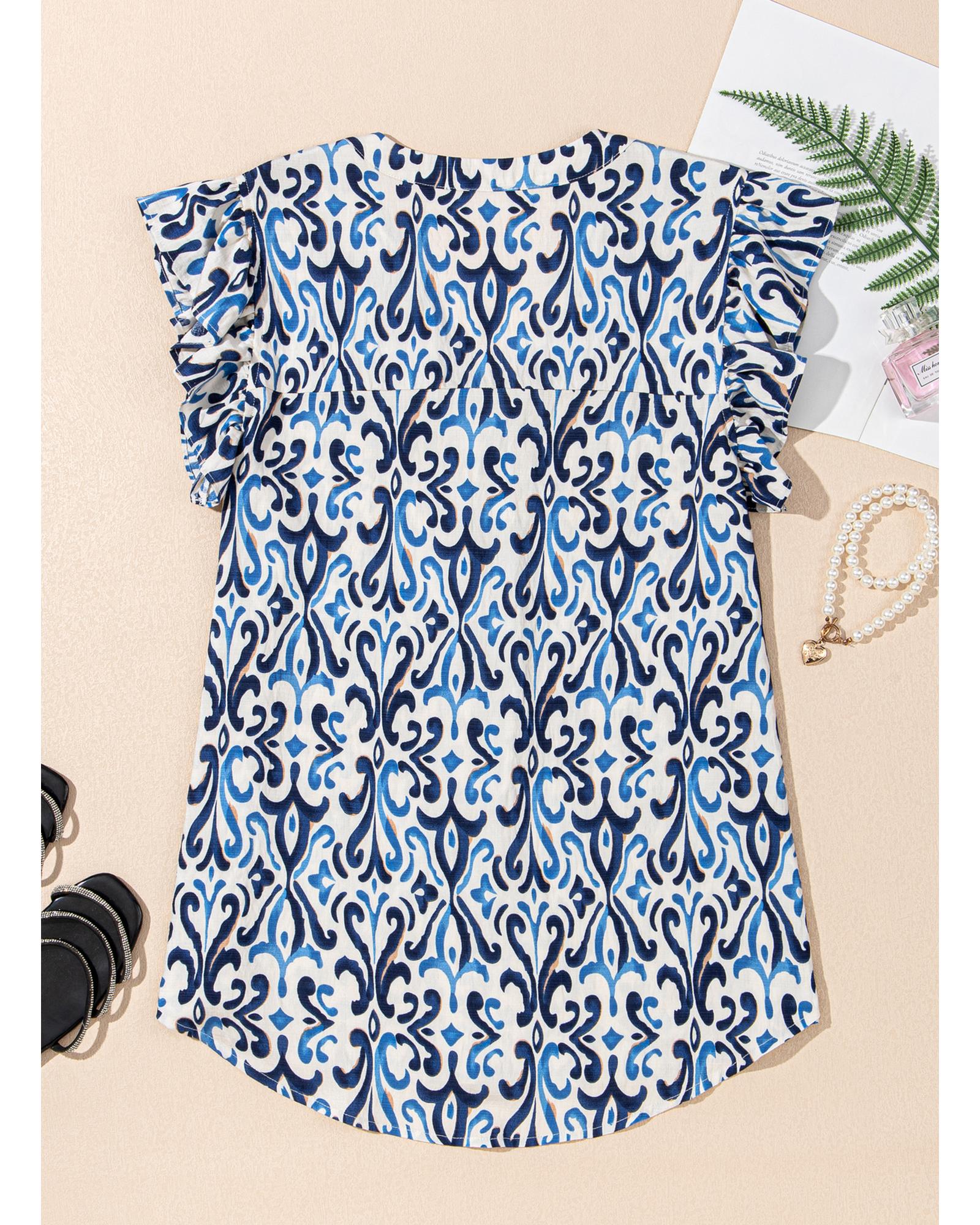 Sky Blue Boho Abstract Print Pintuck Detail Ruffled Top – L