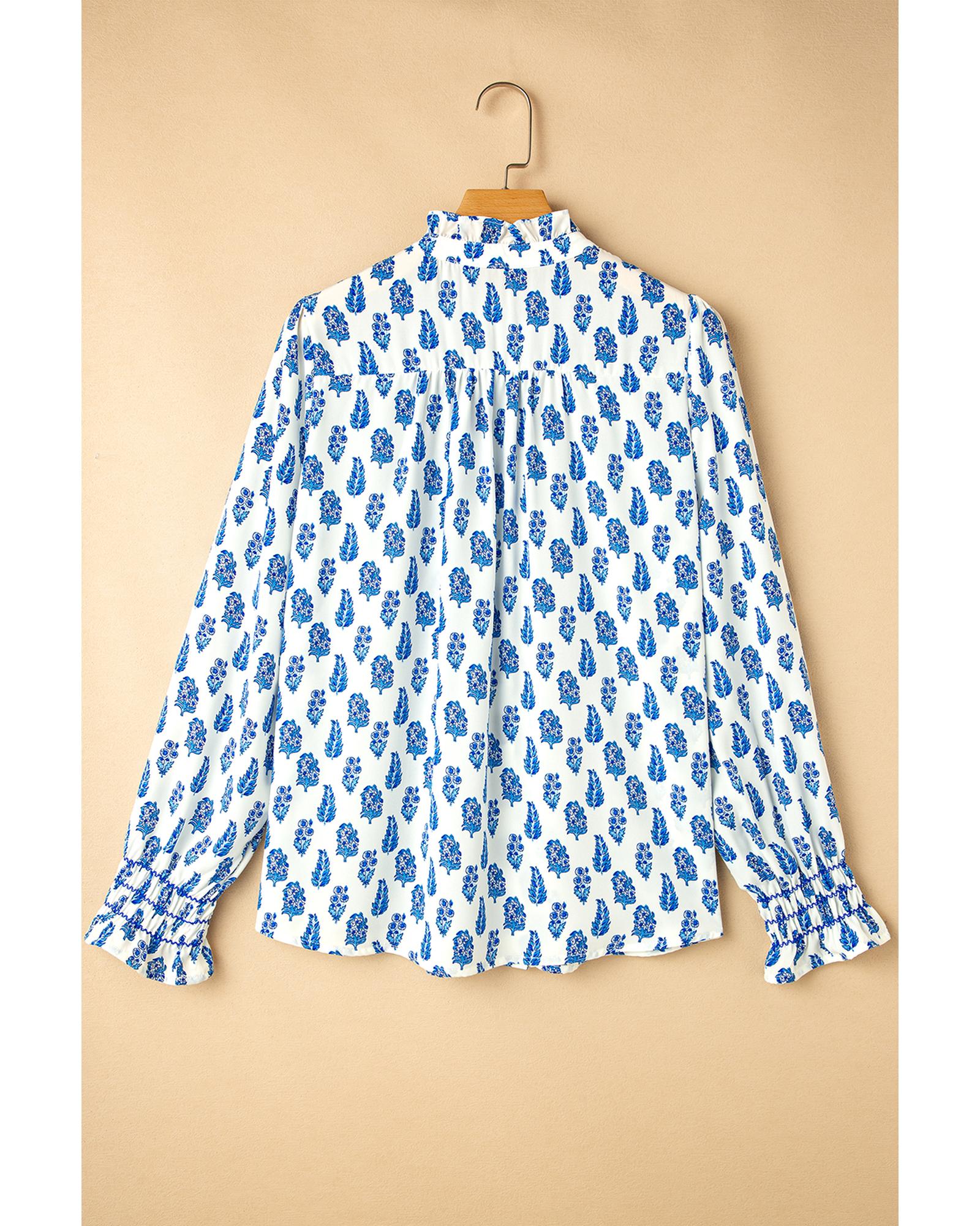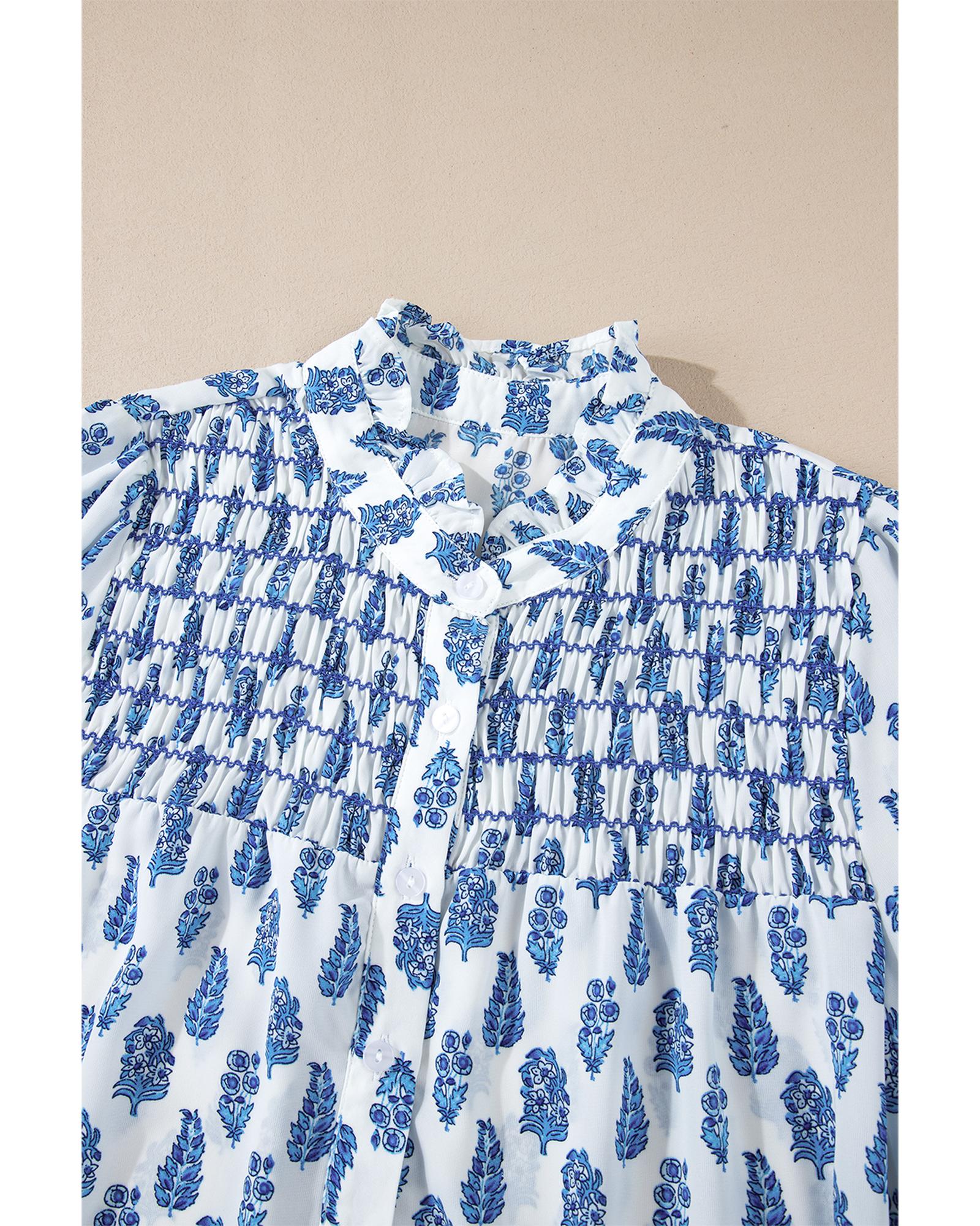 Sky Blue Boho Floral Printed Lantern Sleeve Frilled Neck Shirred Shirt – XL