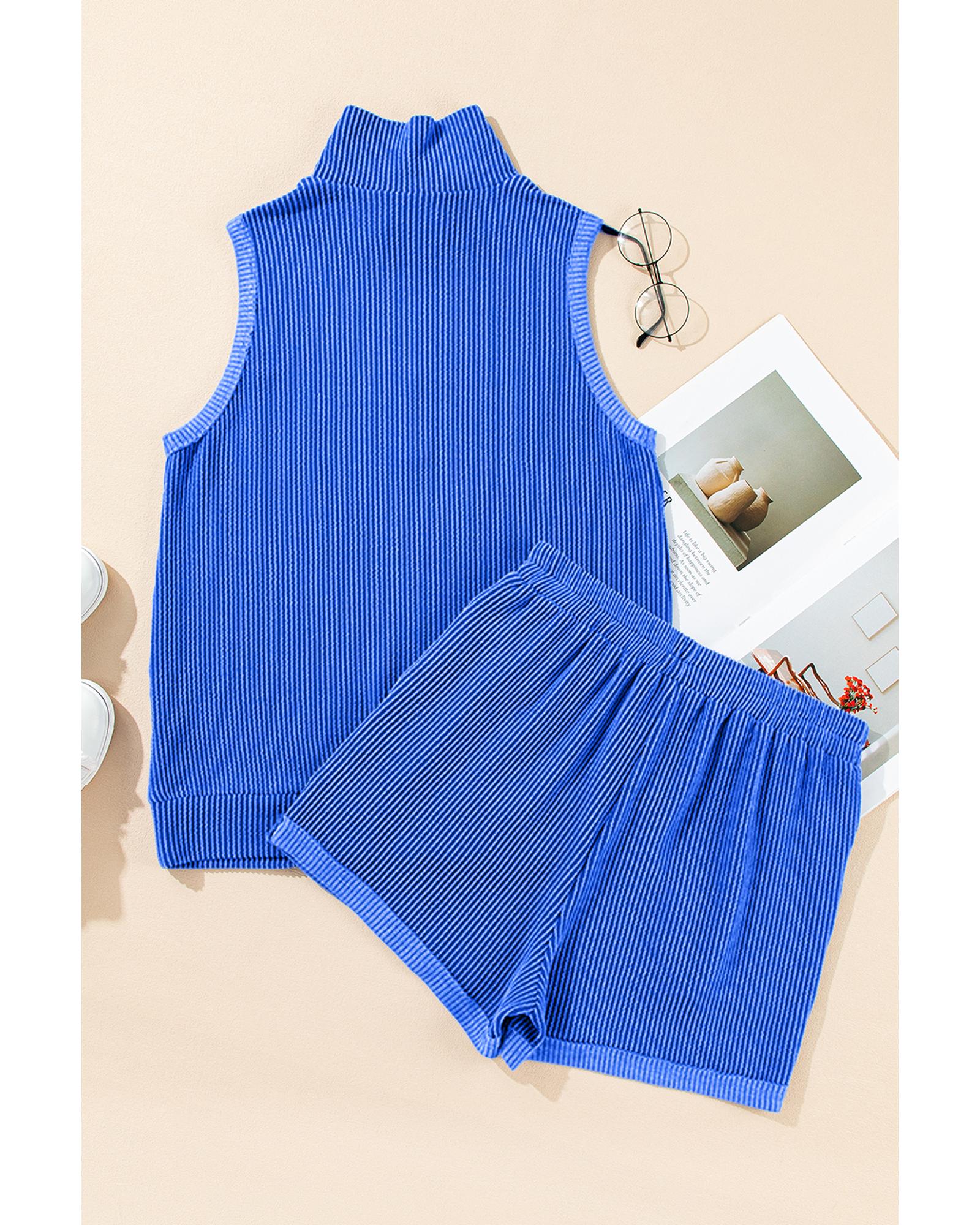 Sky Blue Corded Collared Half Zip Tank Top Two Piece Shorts Set – L