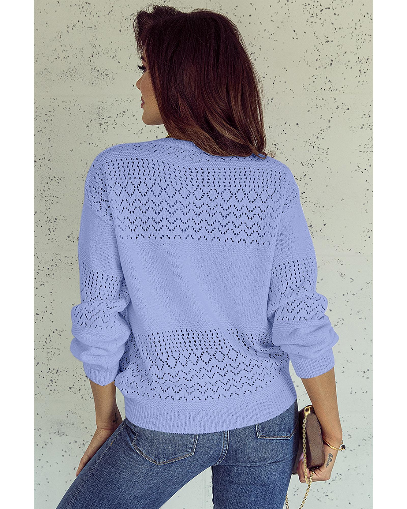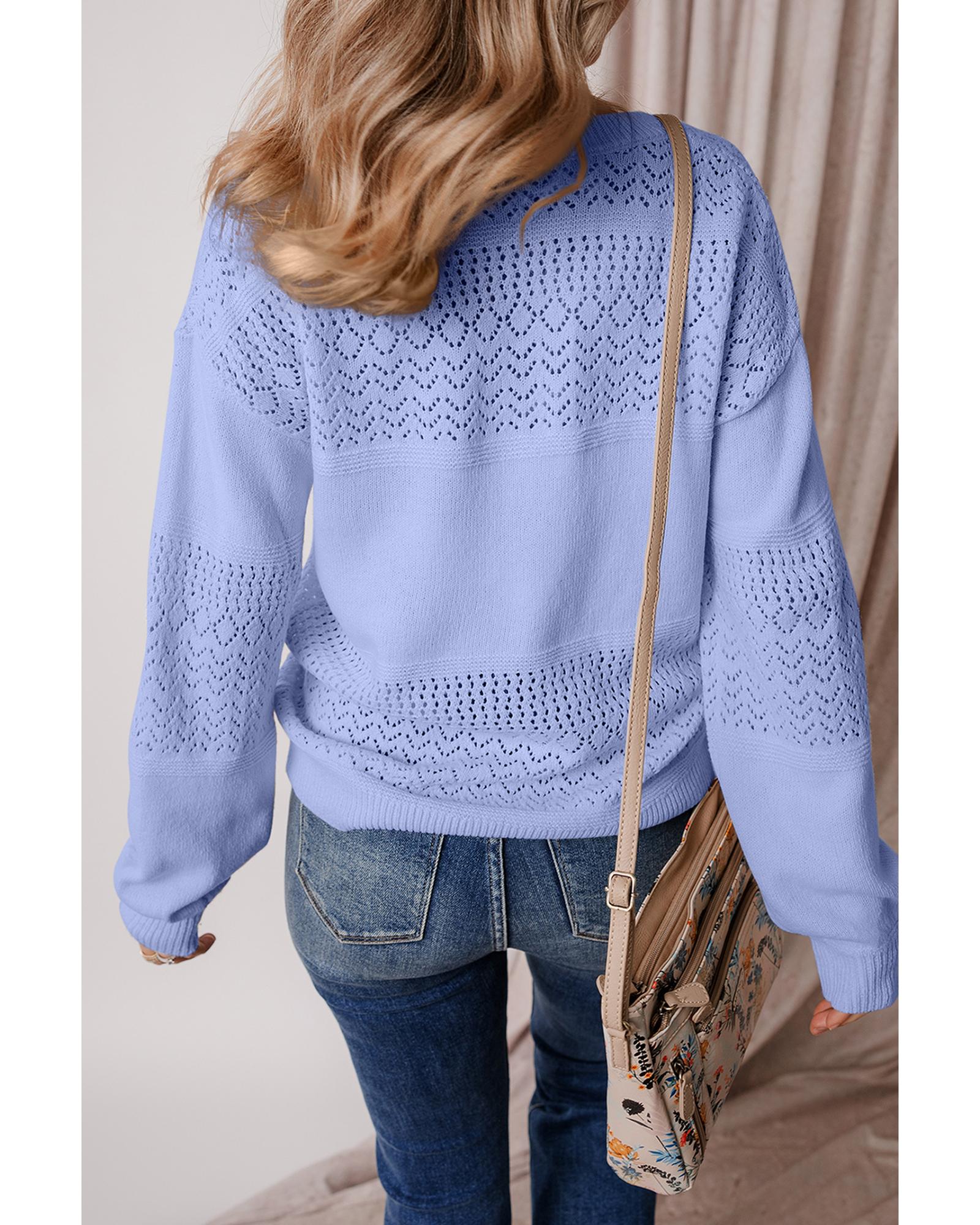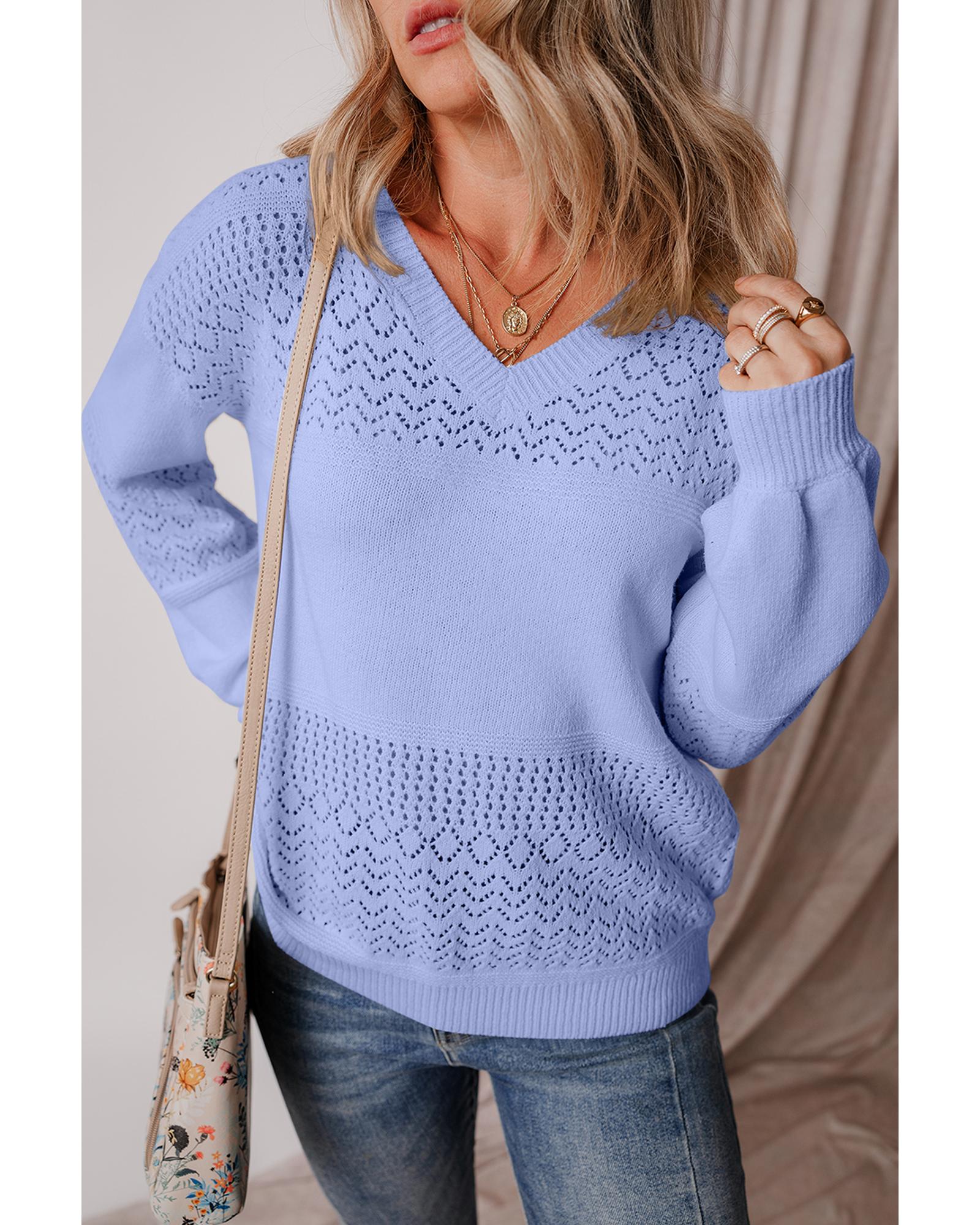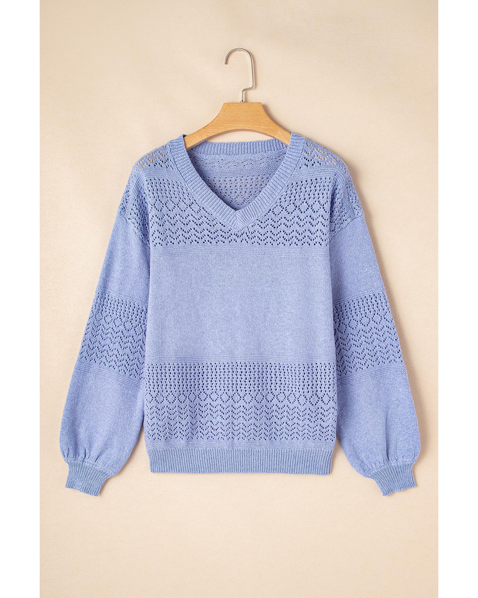 Sky Blue Eyelet Pattern Detail V Neck Drop Shoulder Sweater – S