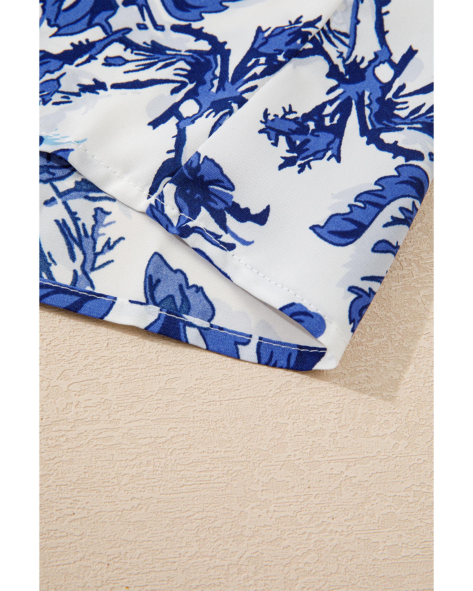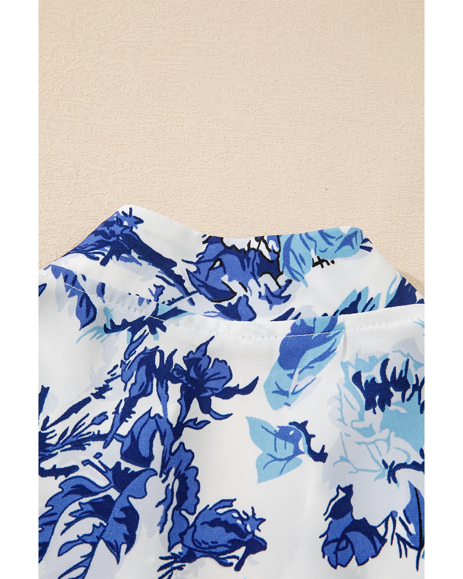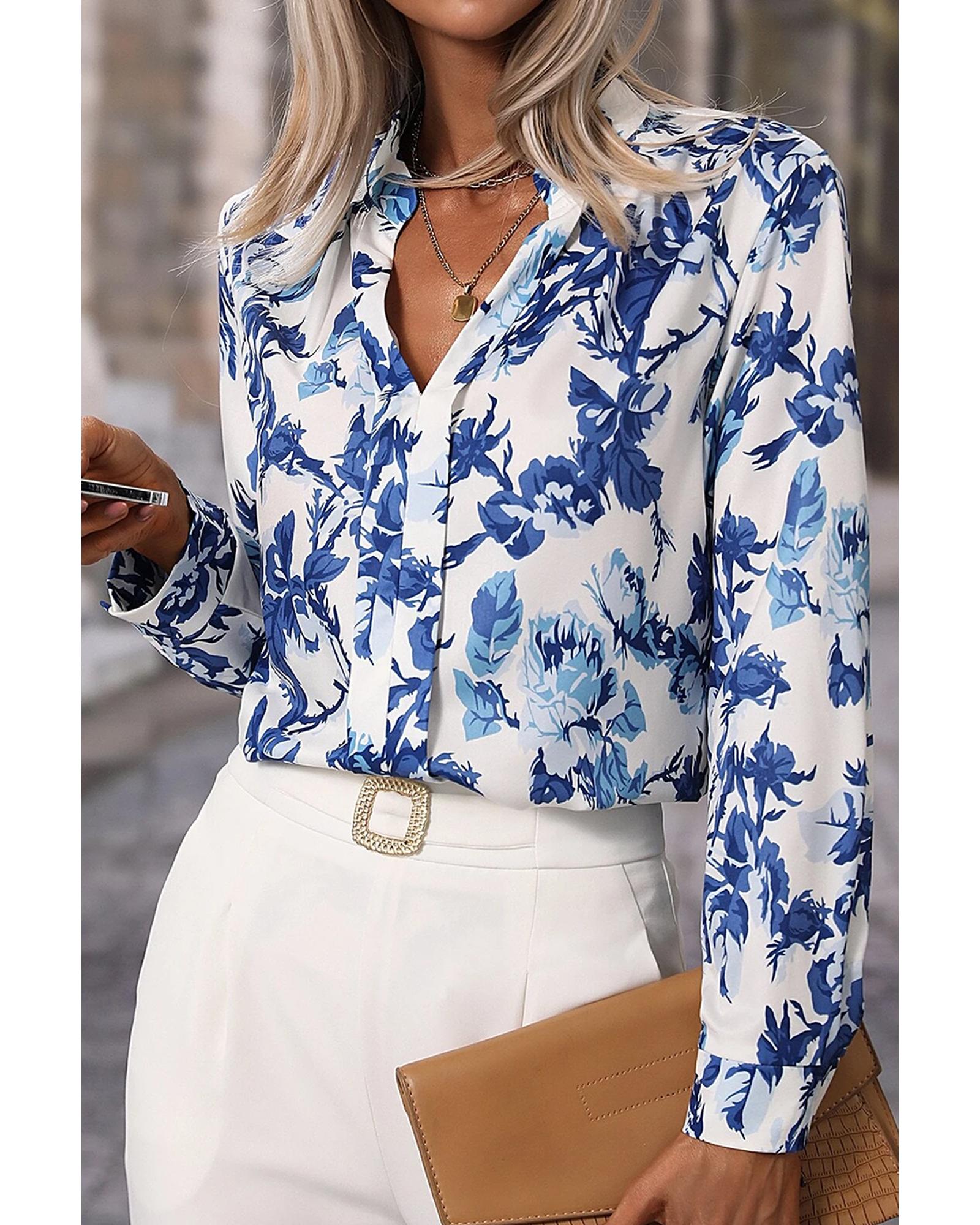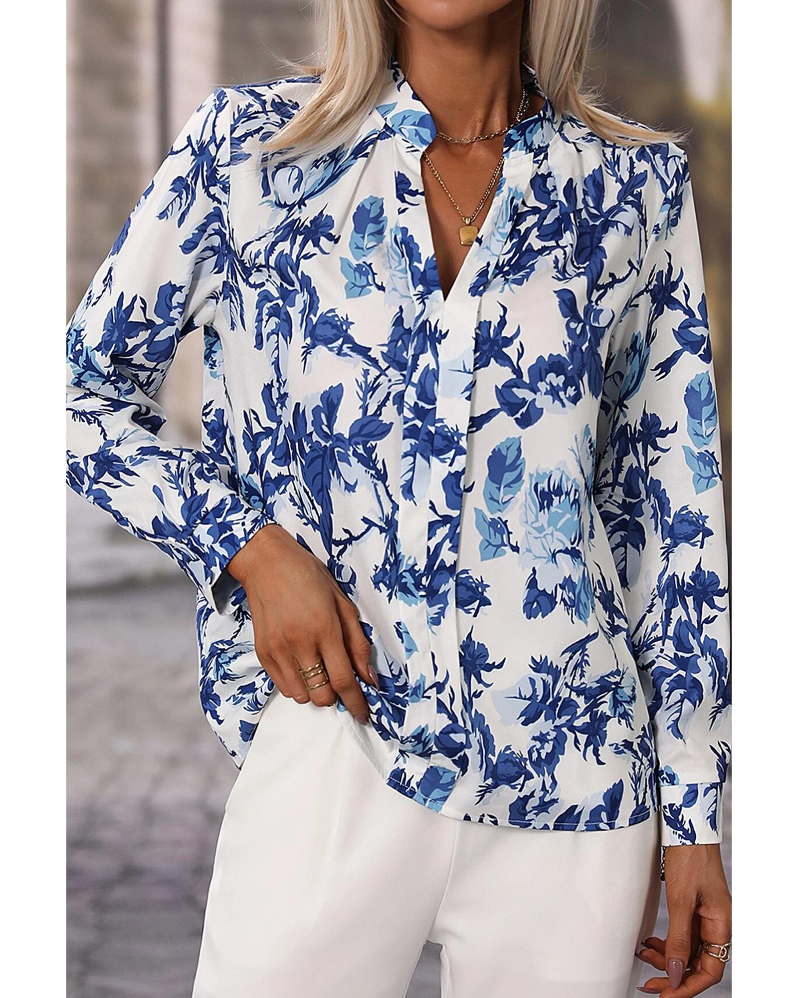Sky Blue Floral Print Notched Neck Elegant Blouse – L