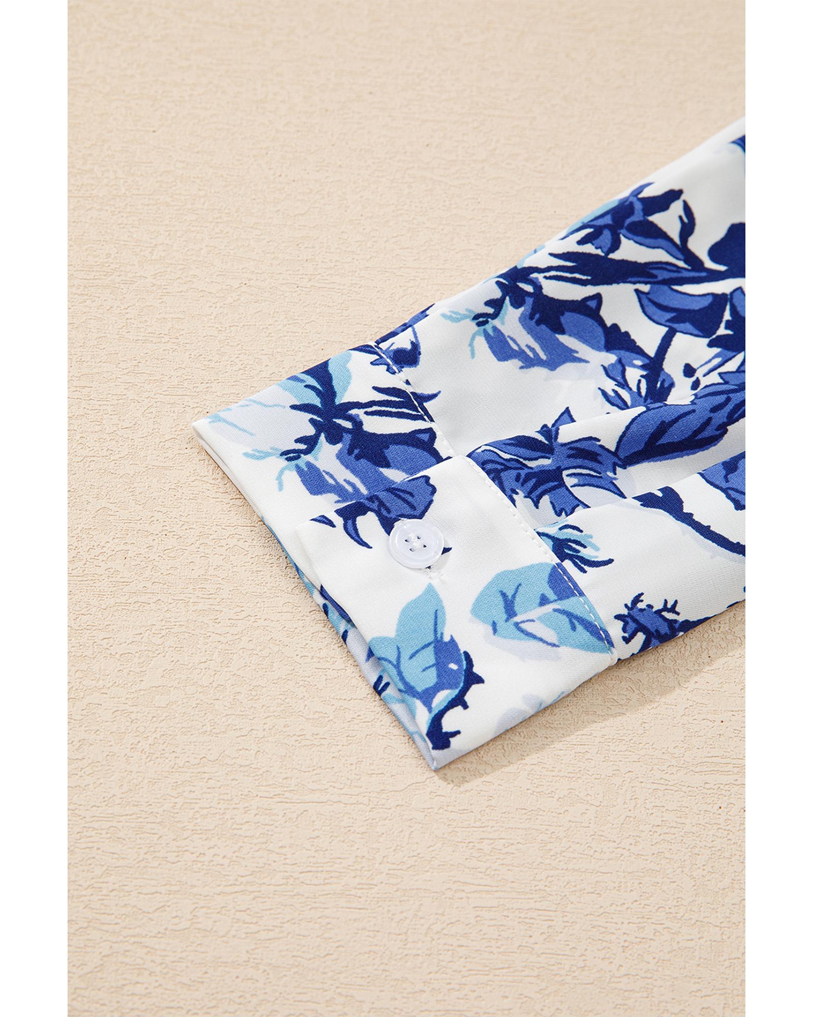 Sky Blue Floral Print Notched Neck Elegant Blouse – S
