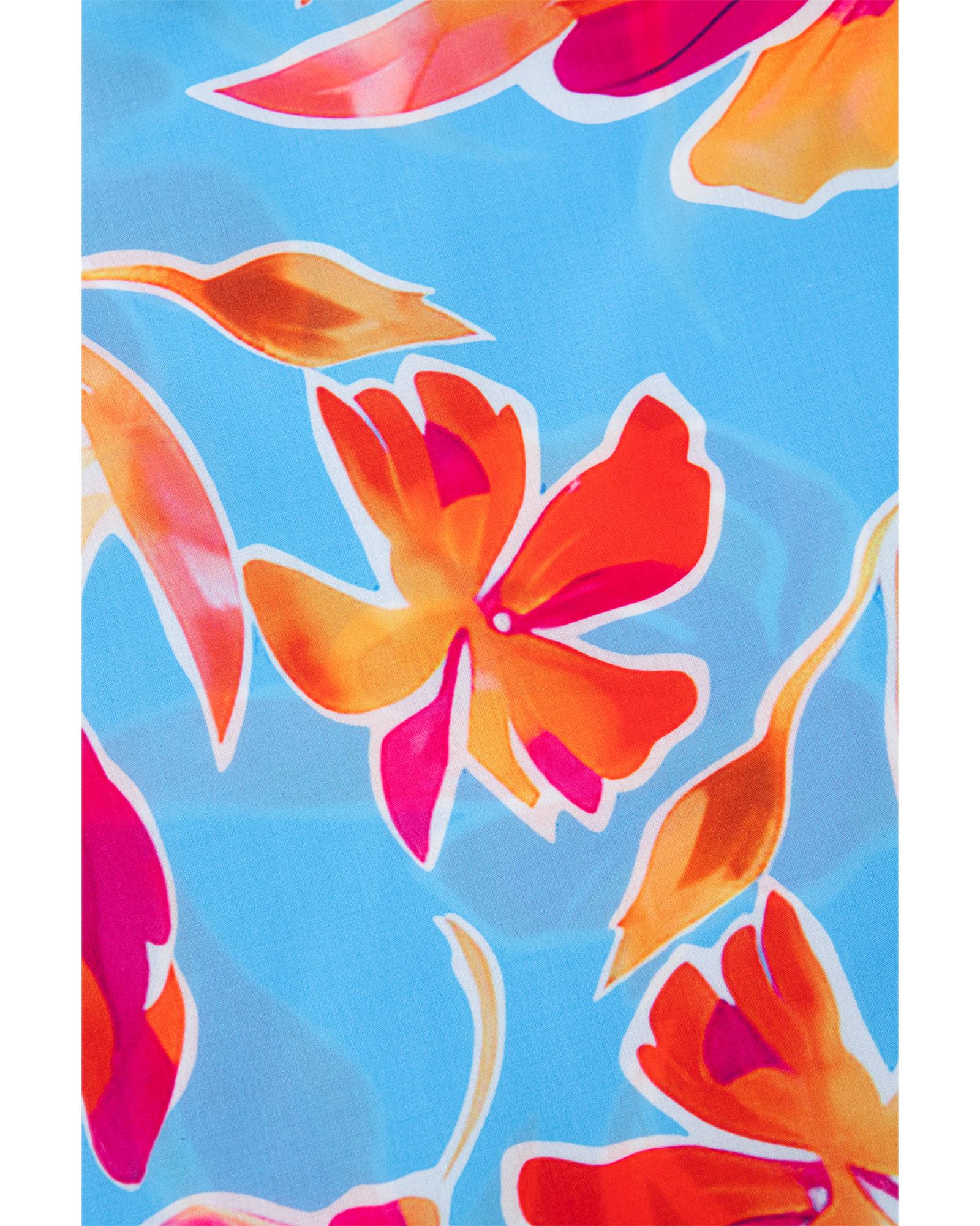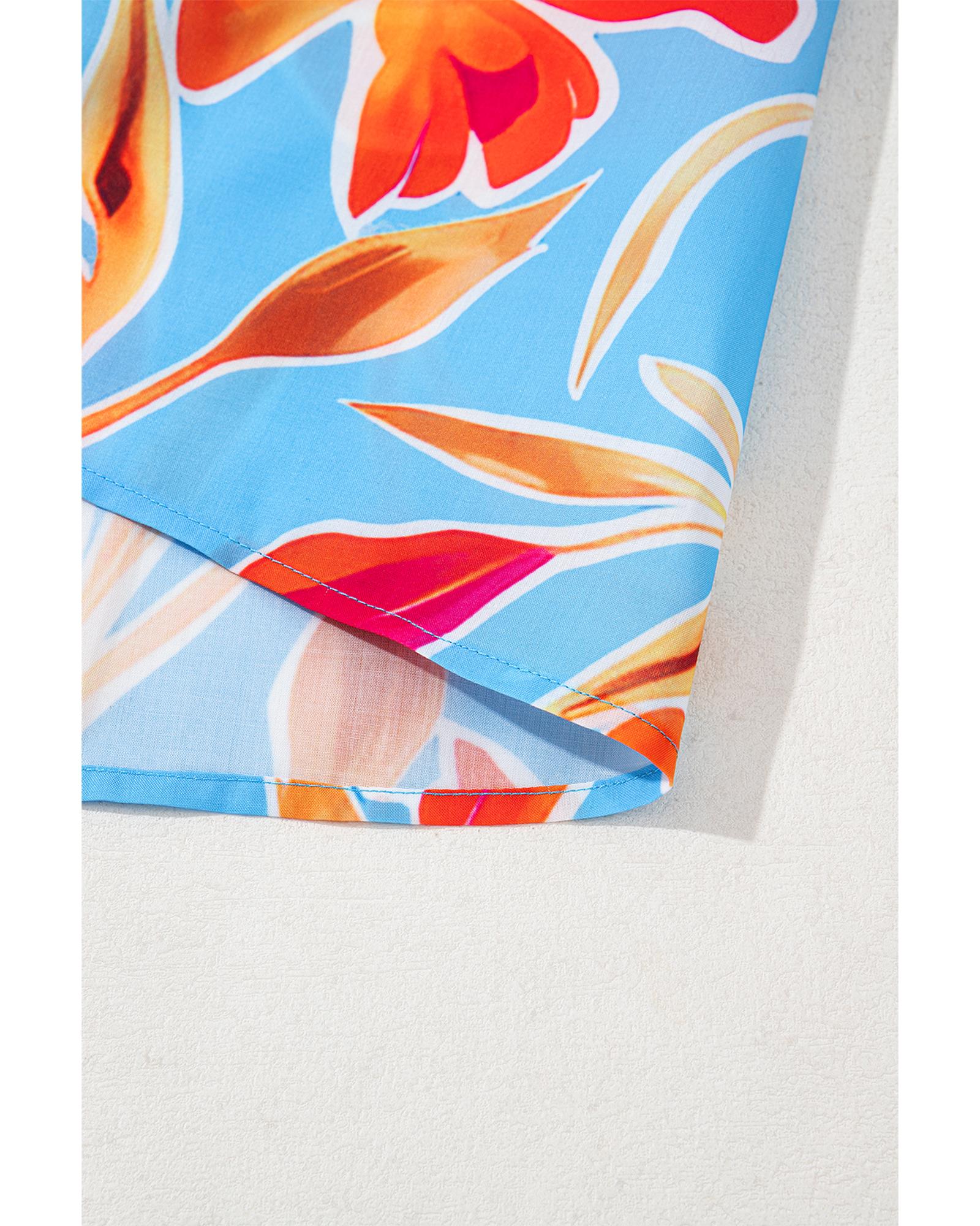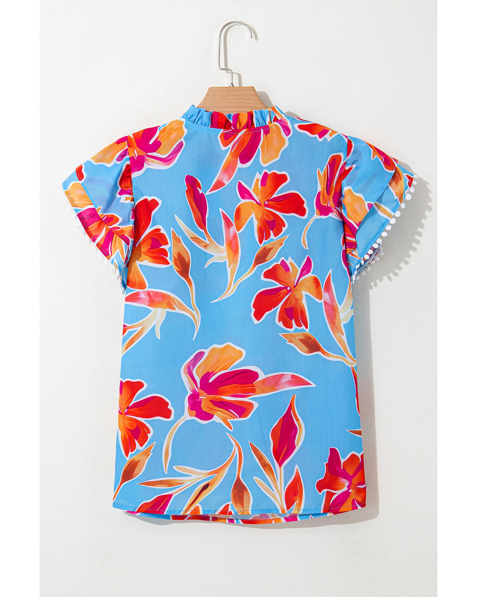 Sky Blue Floral Print V Neck Pompom Trim Flutter Sleeve Blouse – XL