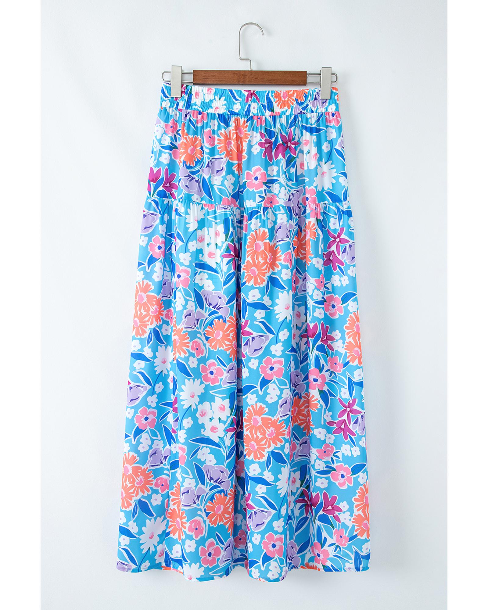 - Sky Blue Floral Printed High Waist Split Wrap Long Skirt