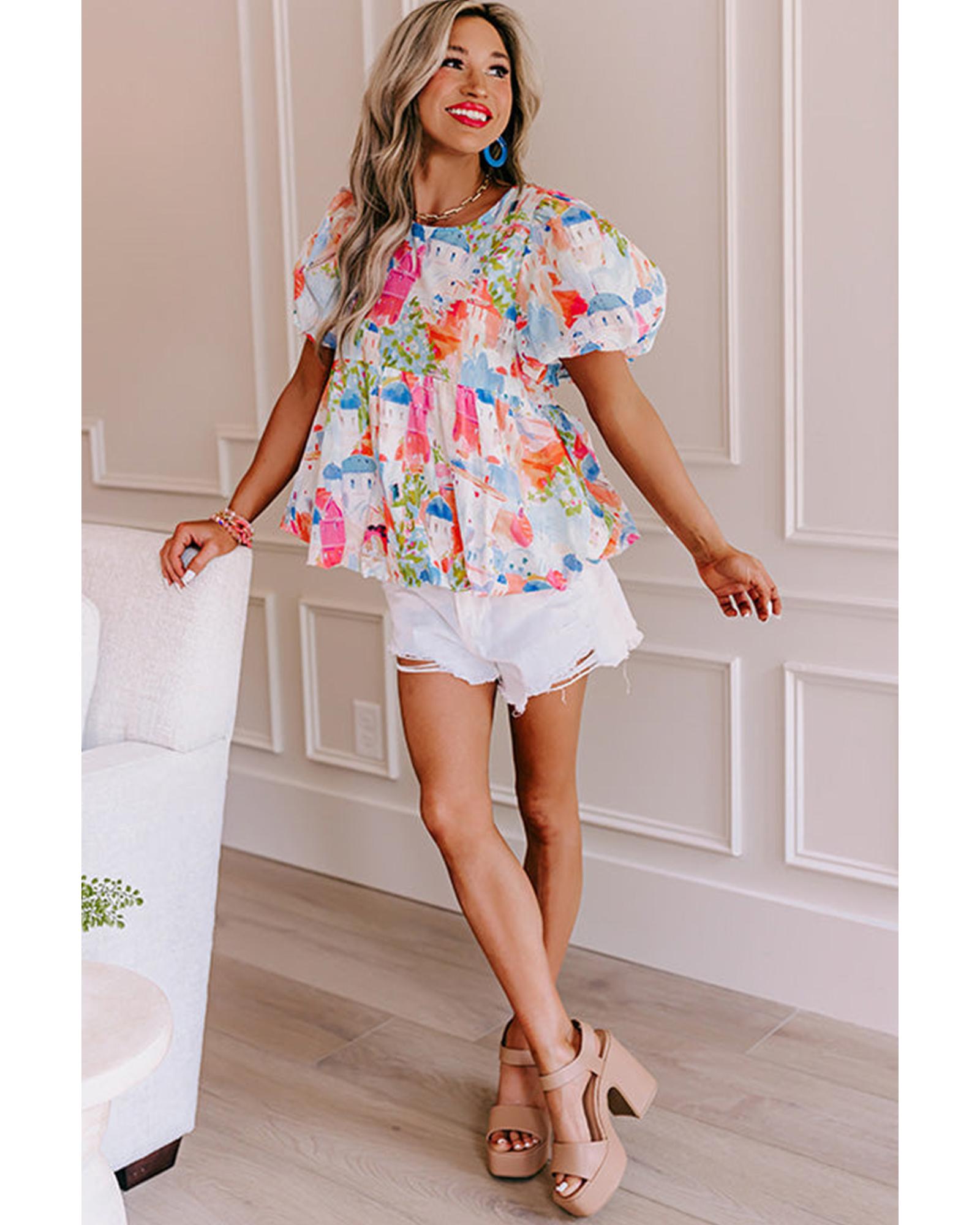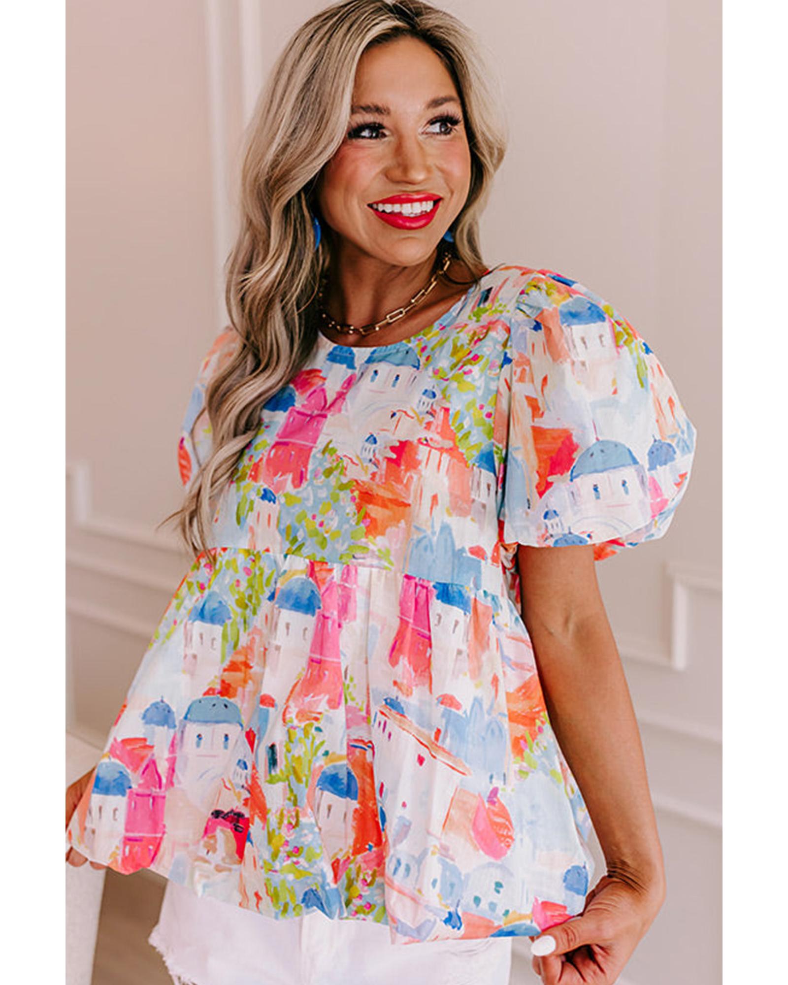 Blue Floral Color Block Patchwork Ruffled Hem Round Neck Blouse - M