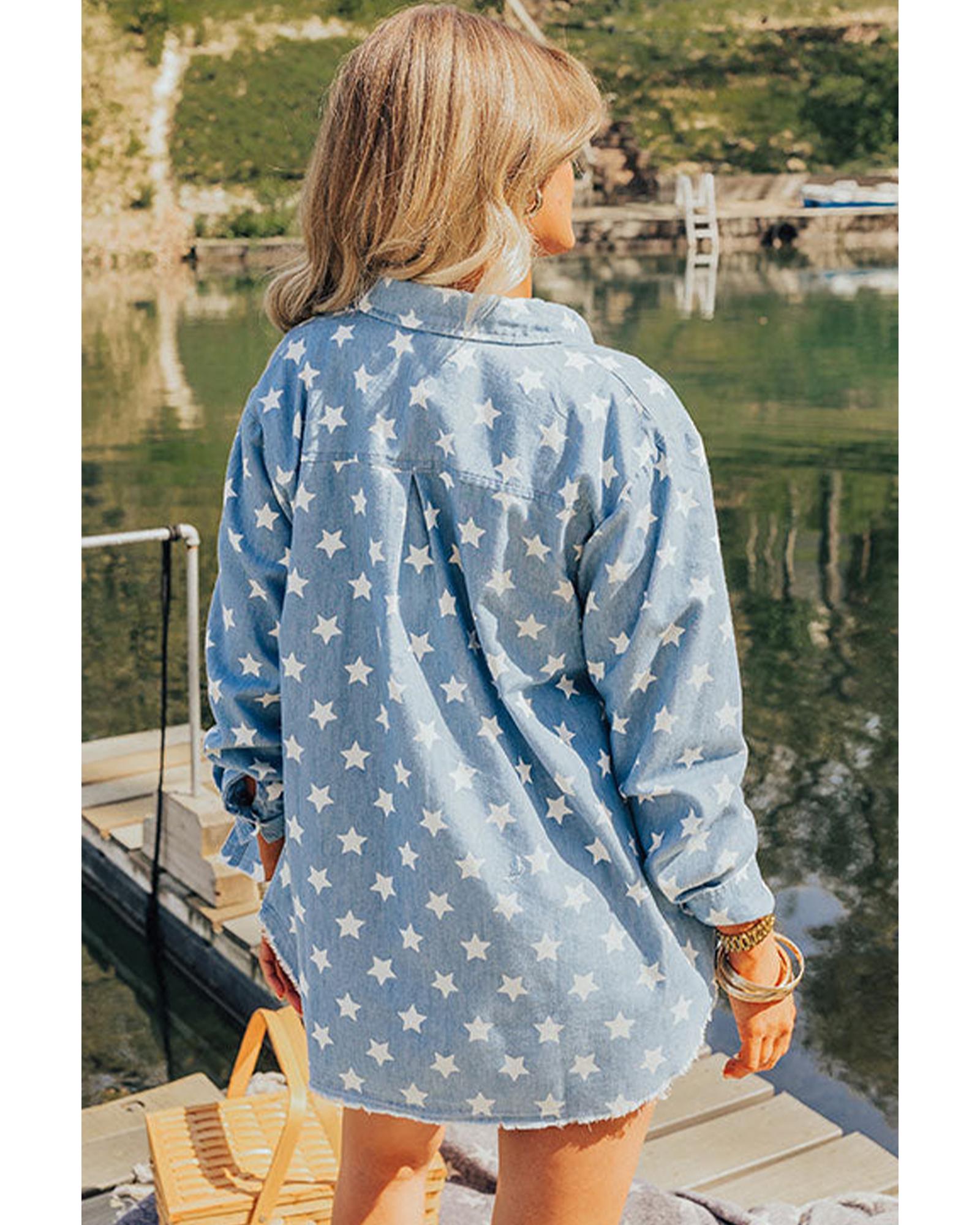 Sky Blue Star Print Light Wash Raw Hem Denim Jacket – XL