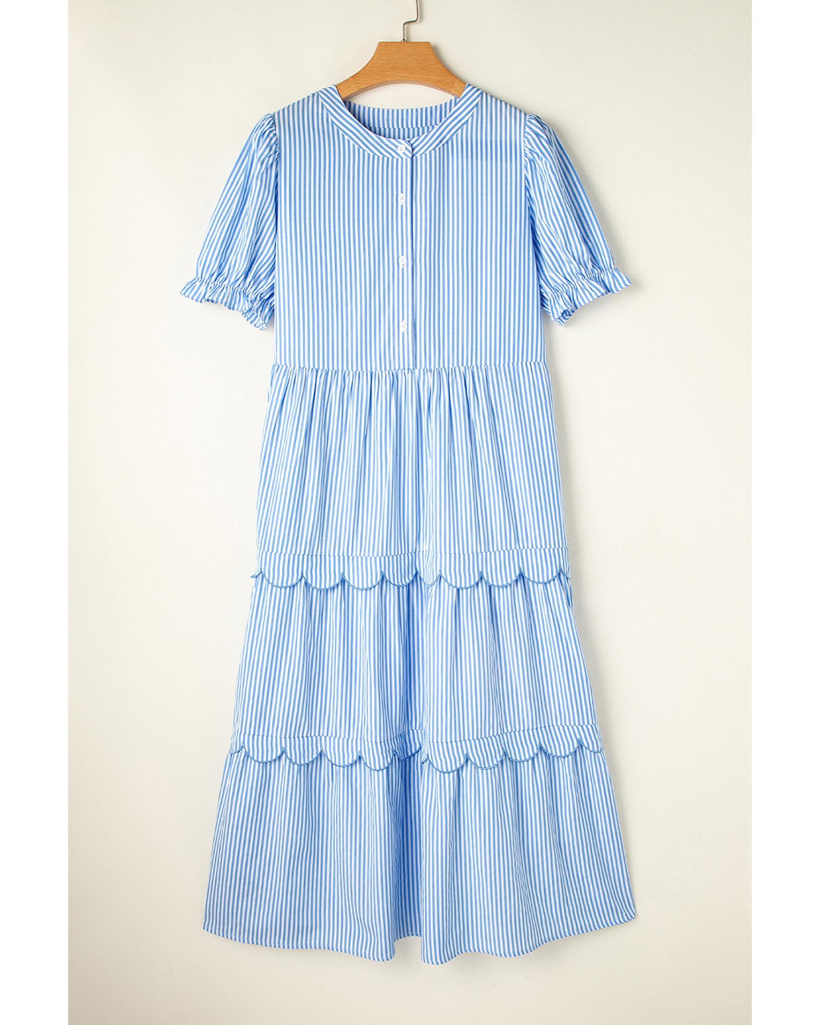 - Sky Blue Stripe Bubble Short Sleeve Tiered Scallop Long Dress