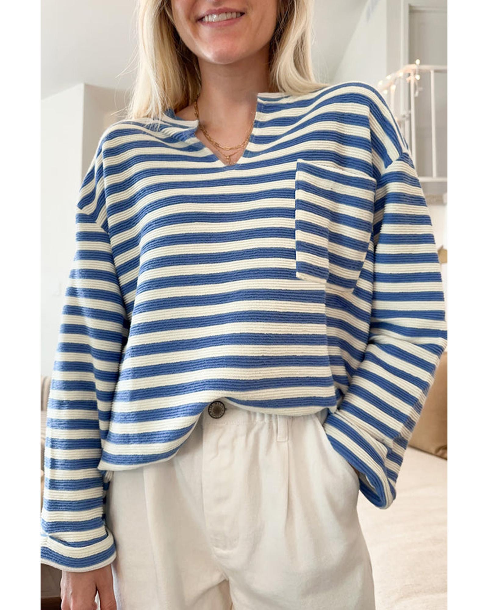 Sky Blue Stripe Chest Pocket Buttoned Back Notched V Neck Top – XL