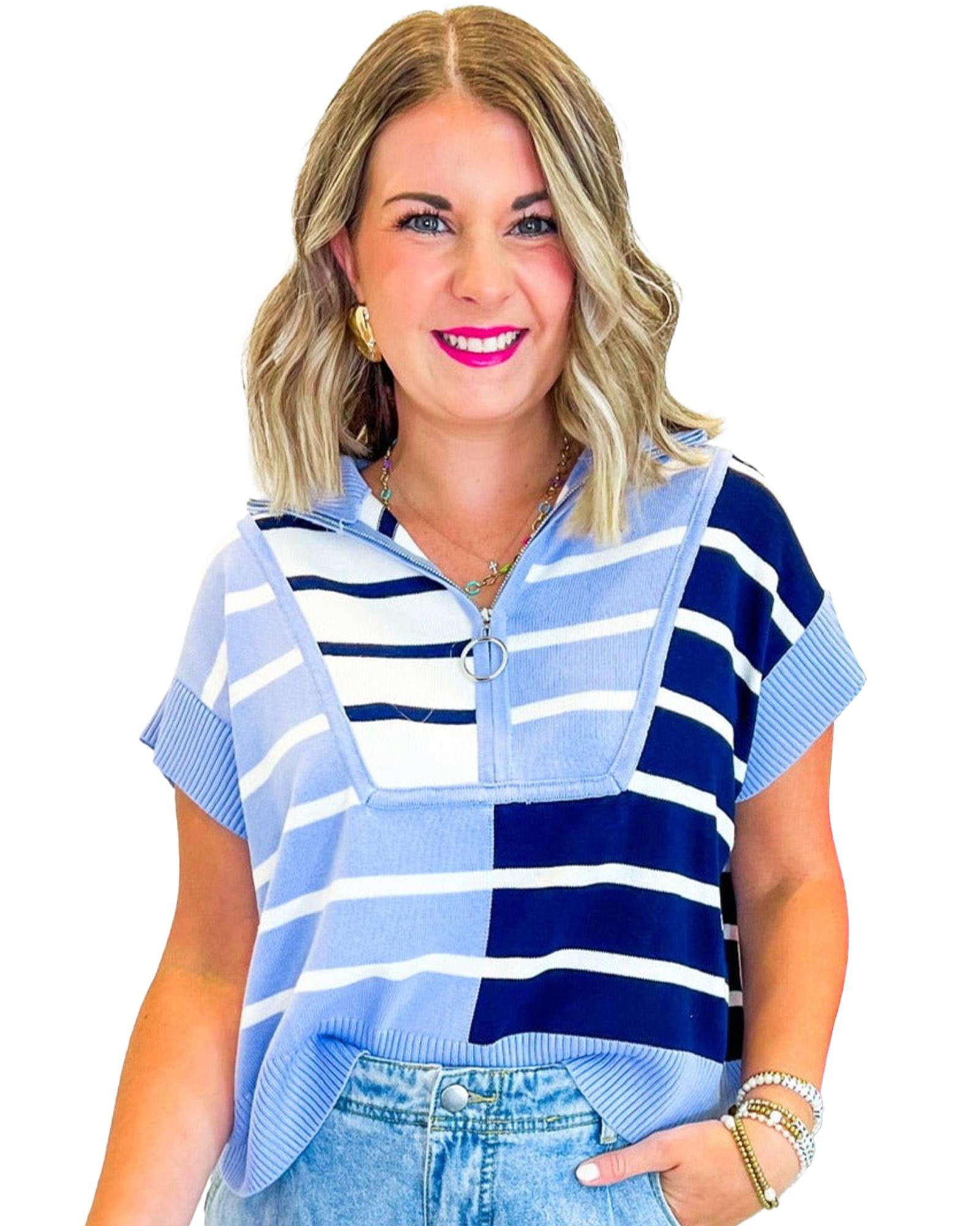 Sky Blue Stripe Colorblock Quarter Zip Collar Sweater Vest – S