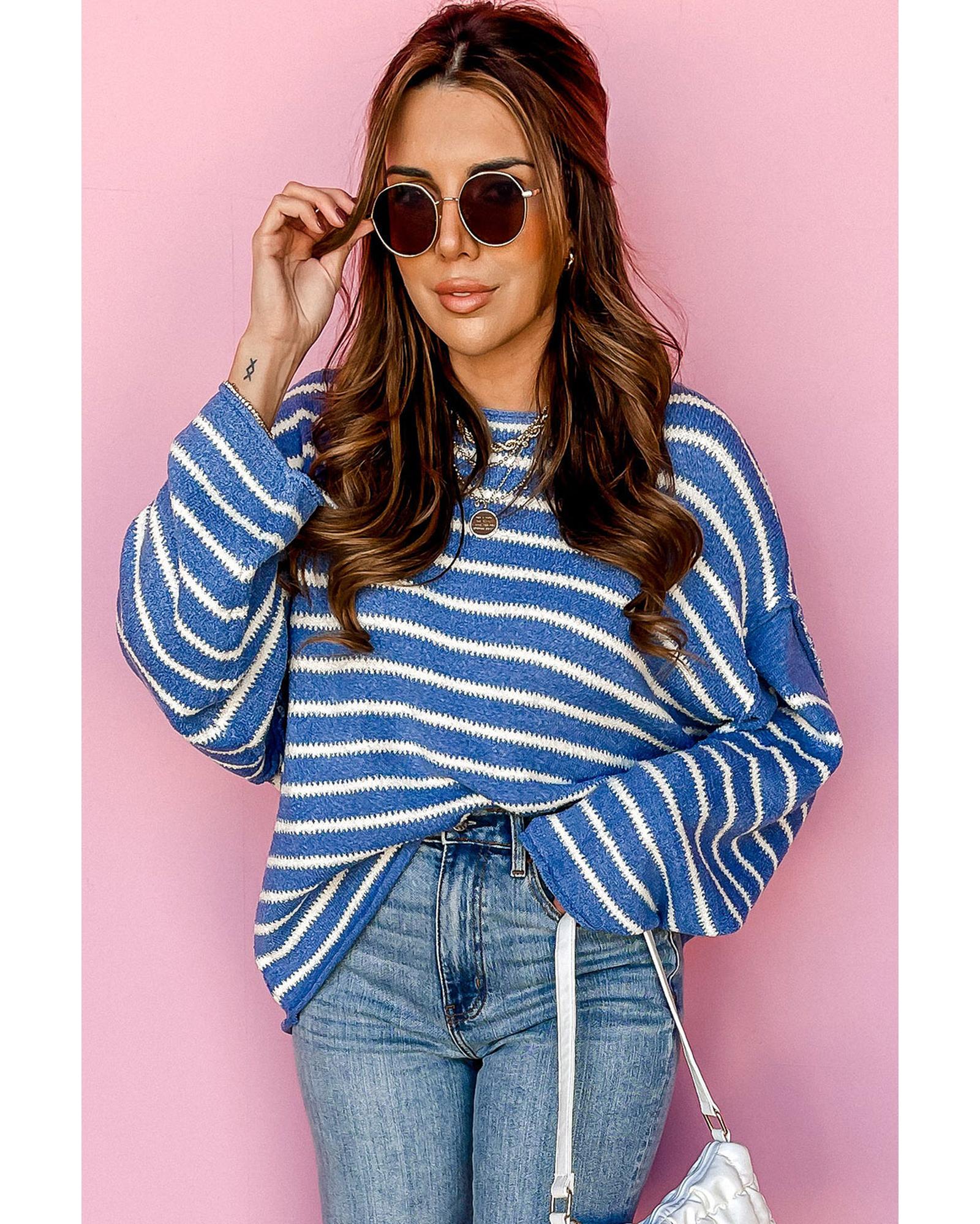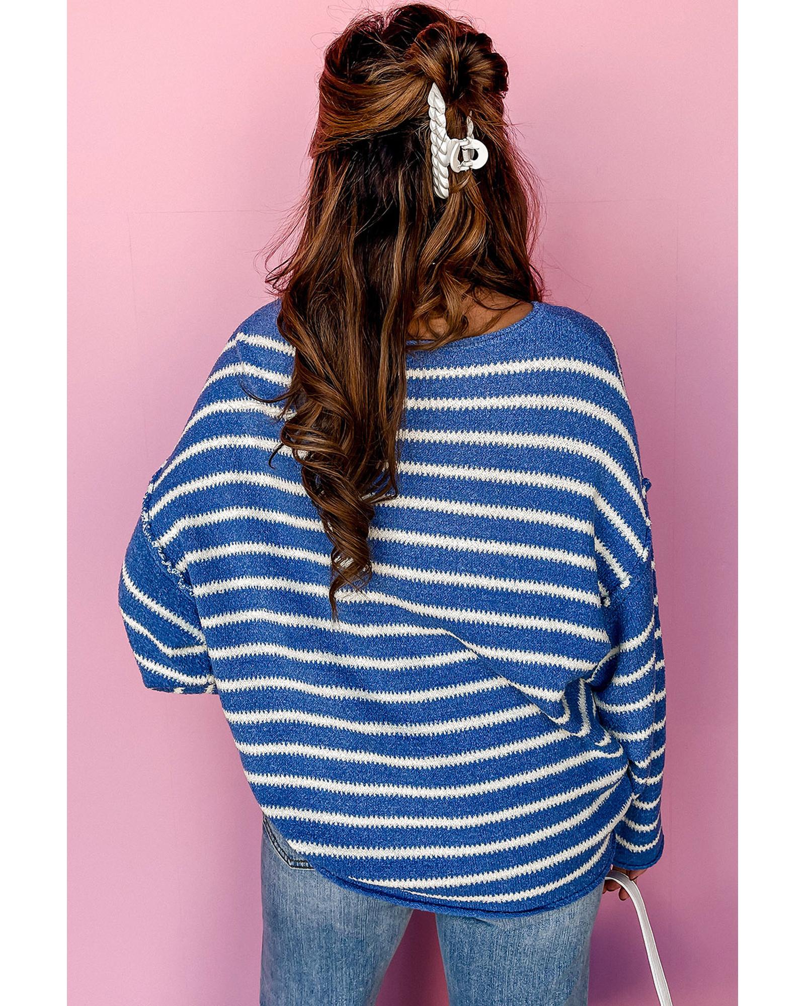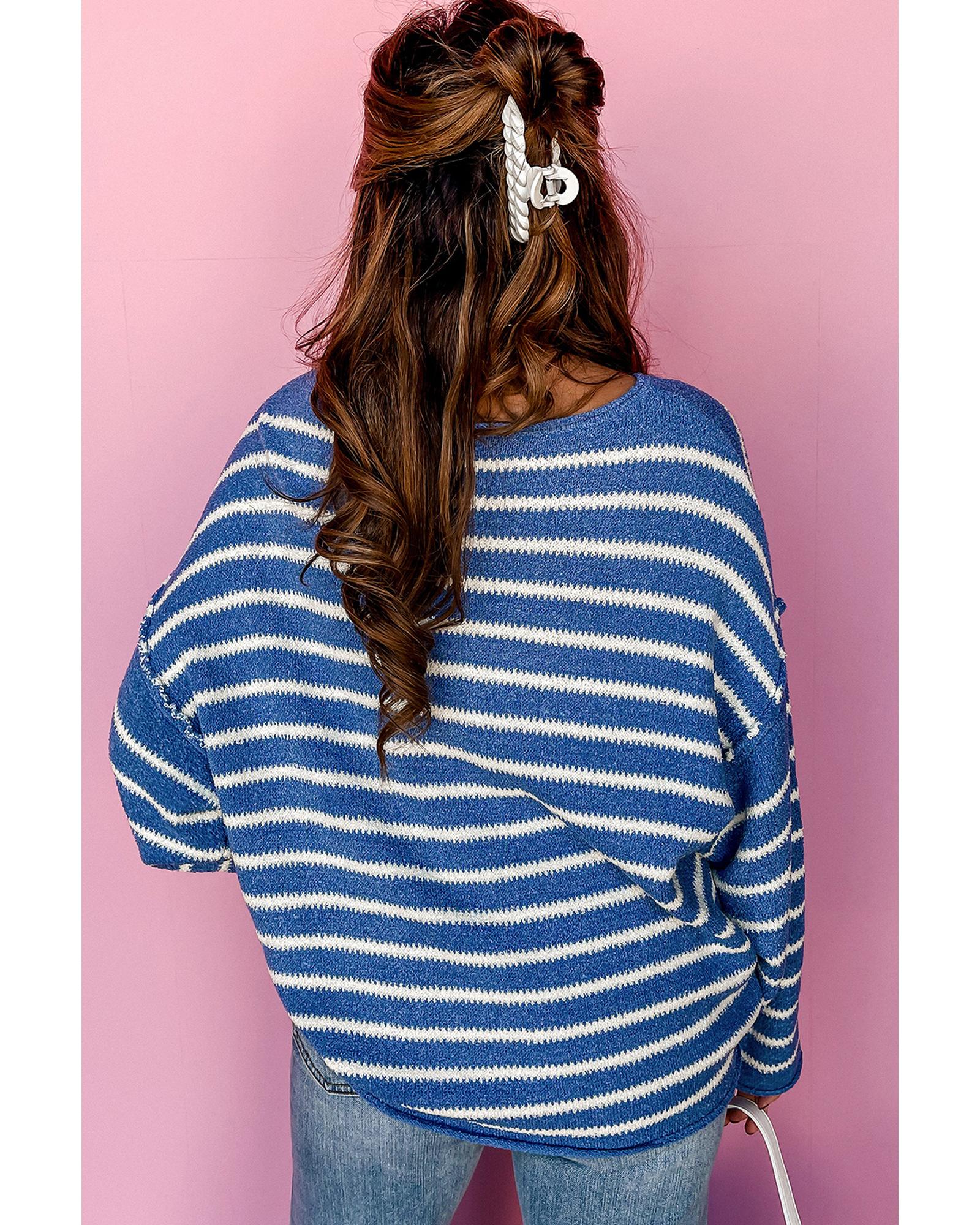 Sky Blue Stripe Drop Shoulder O Neck Plus Size Sweater – 4X