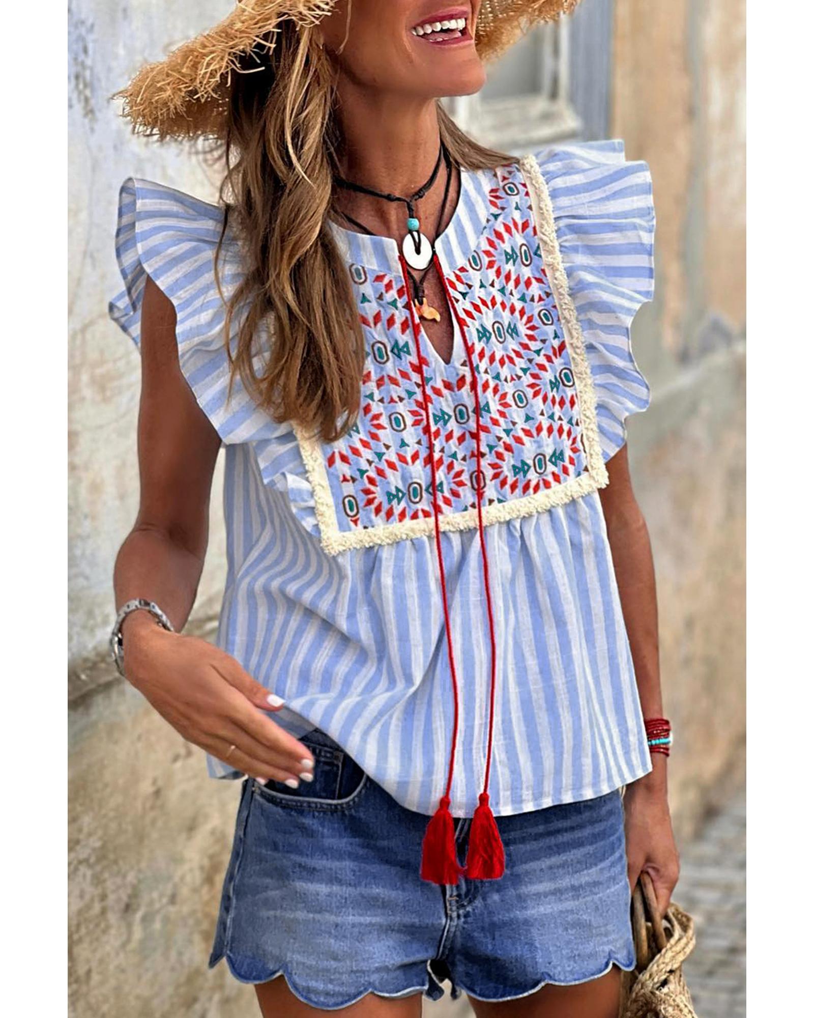 • Sky Blue Stripe Geo Pattern Embroidered Tassel Flutter Blouse
