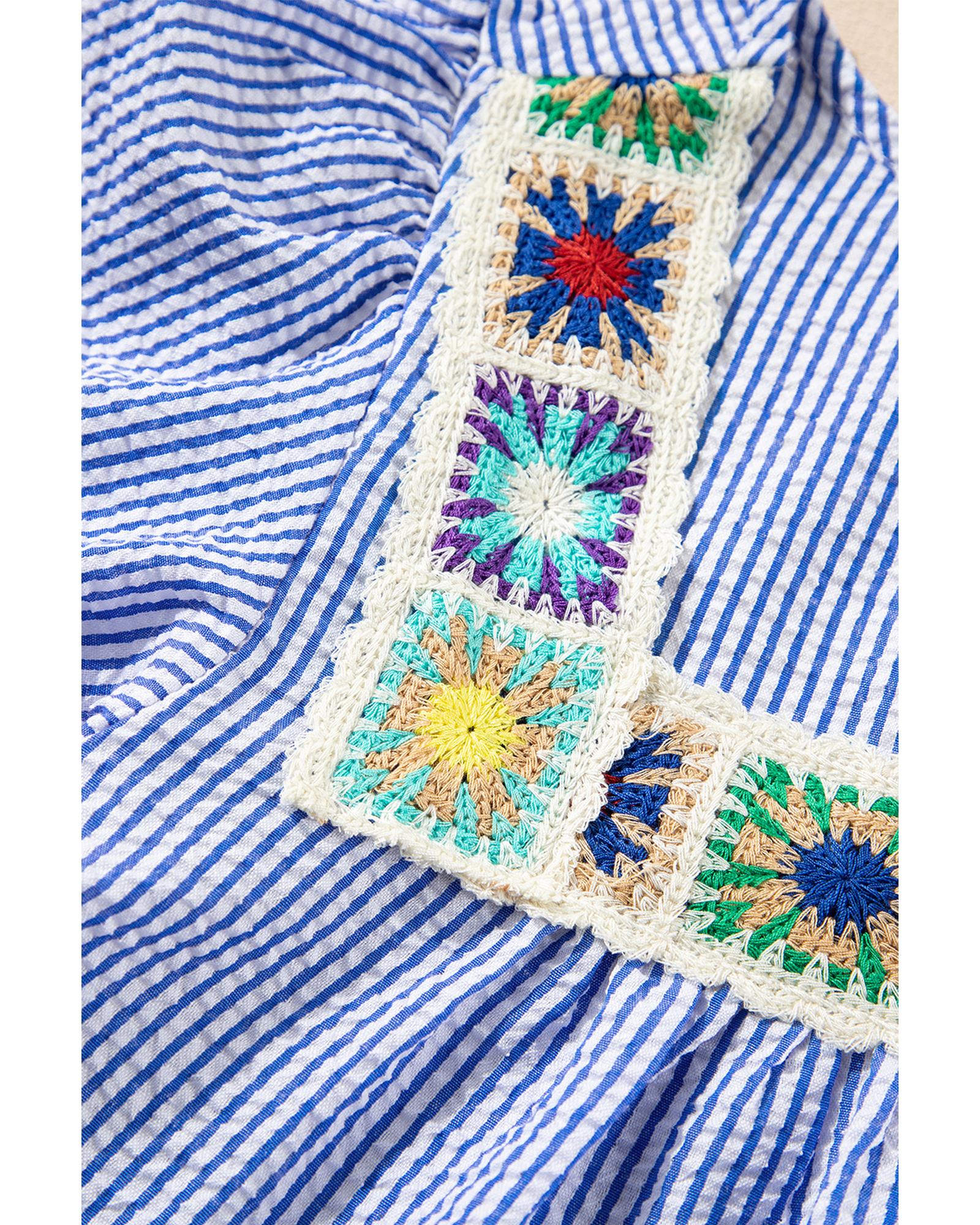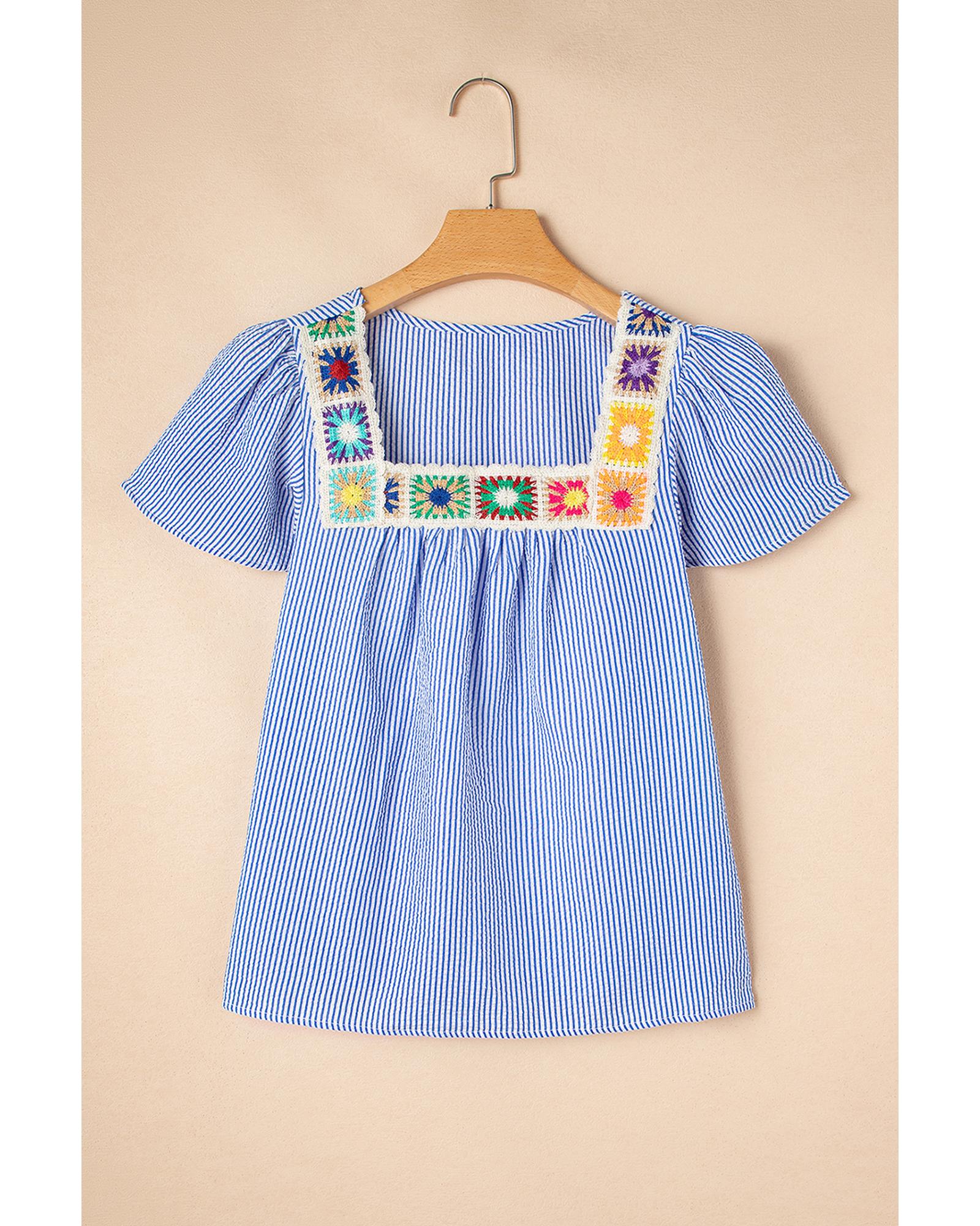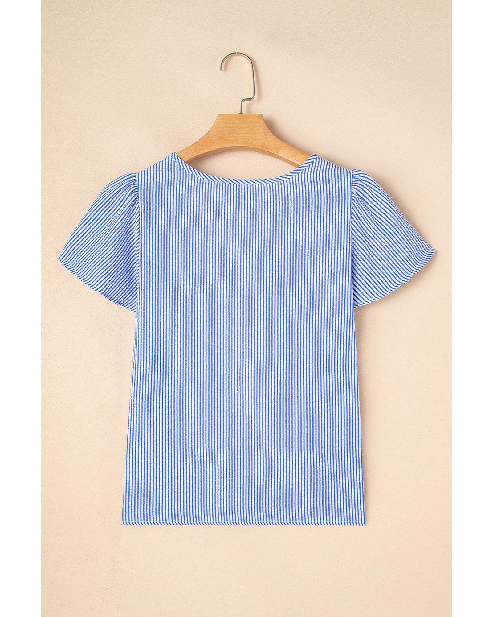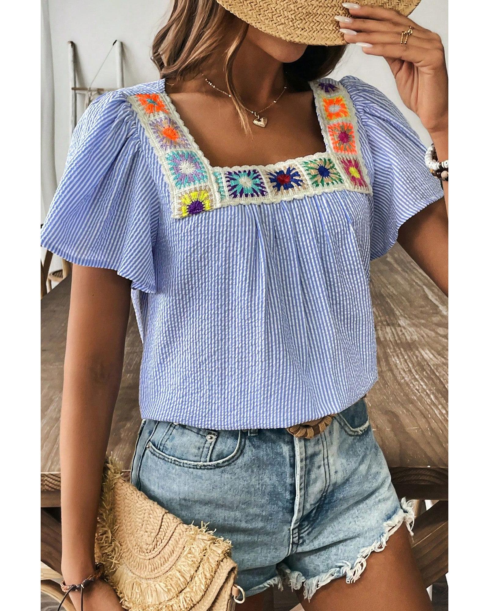 Sky Blue Stripe Textured Ruffle Short Sleeve Boho Detail Square Neck Blouse – XL