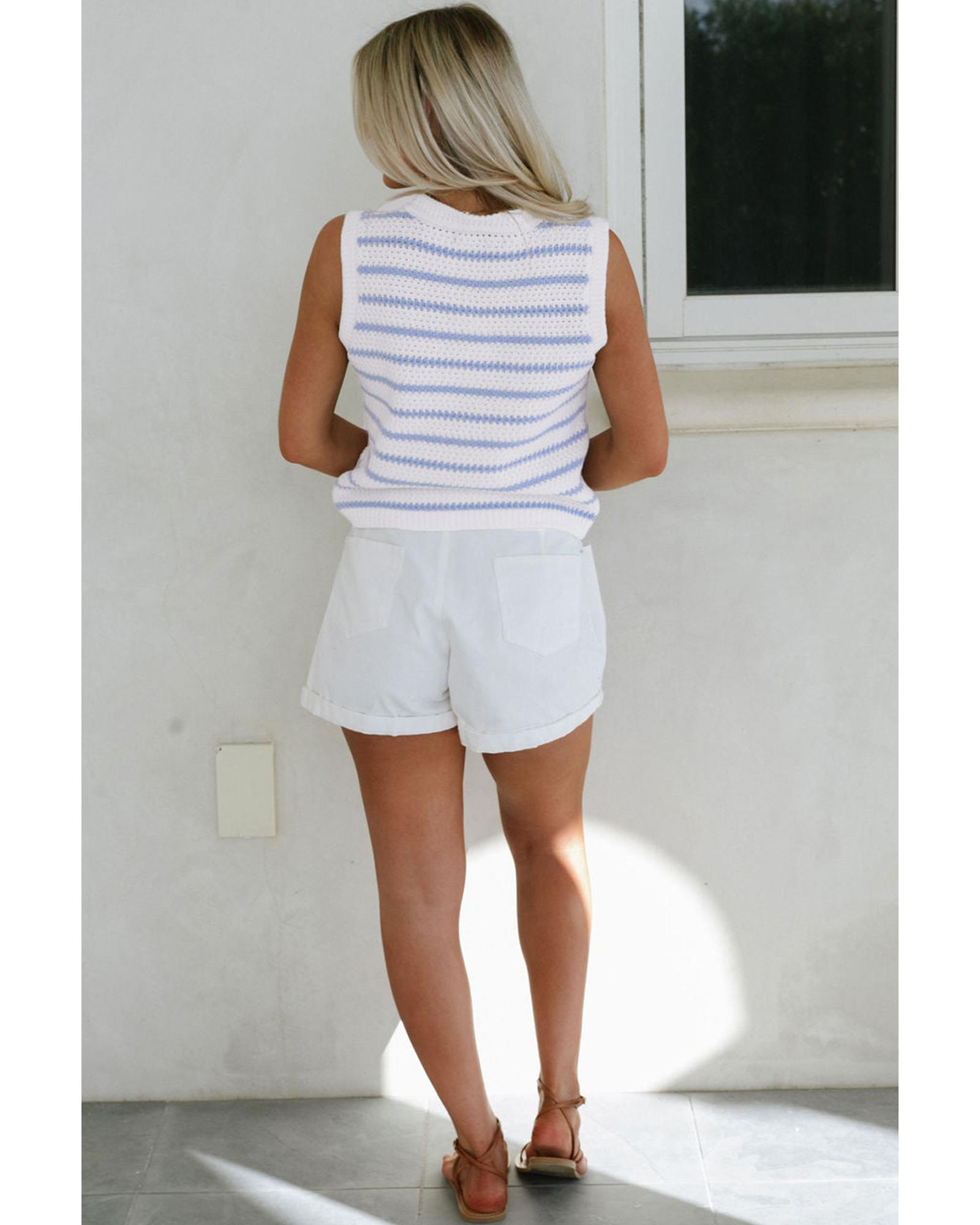 Sky Blue Stripe V Neck Gold Buttons Elegant Sweater Vest – S