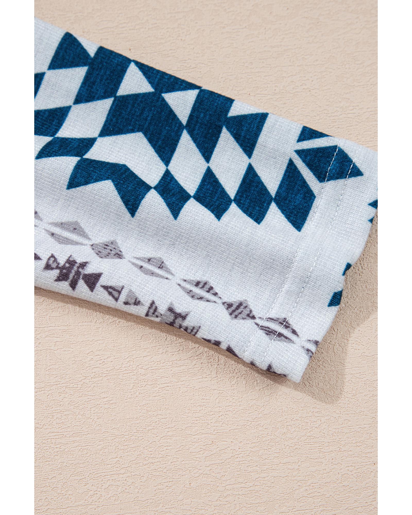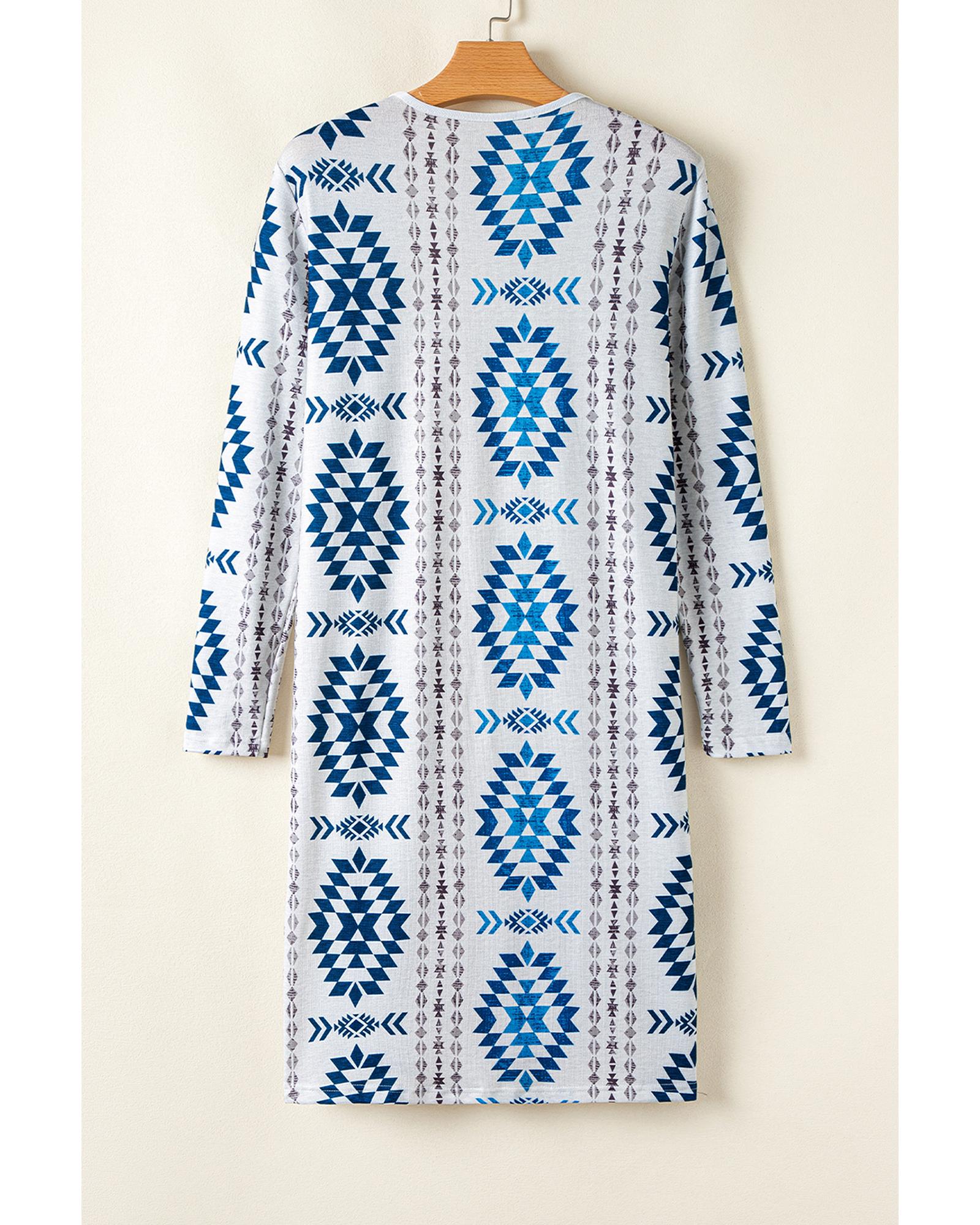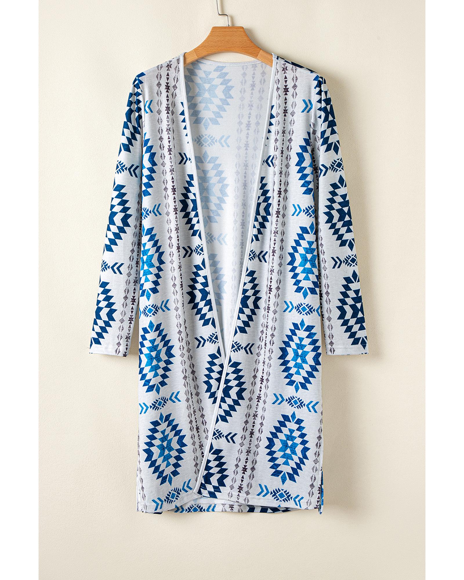 Sky Blue Western Aztec Printed Open Front Long Cardigan – L