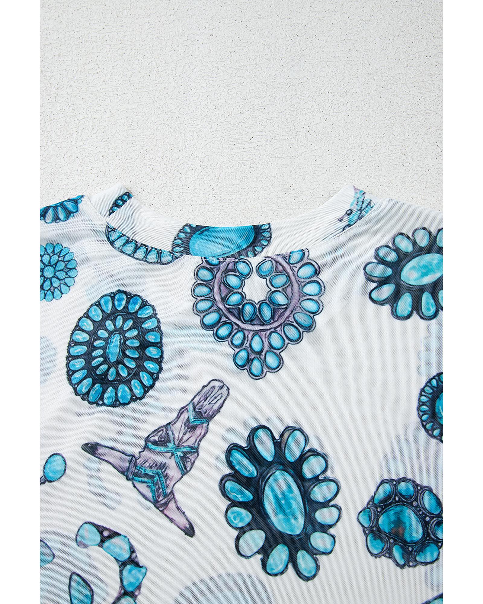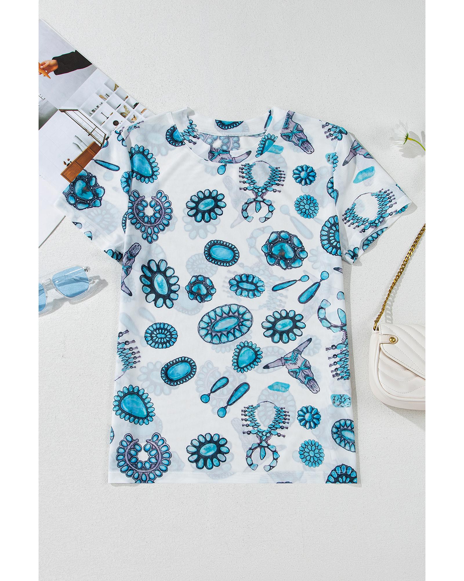 Sky Blue Western Turquoise Printed Crewneck Slim Fit Tee – S