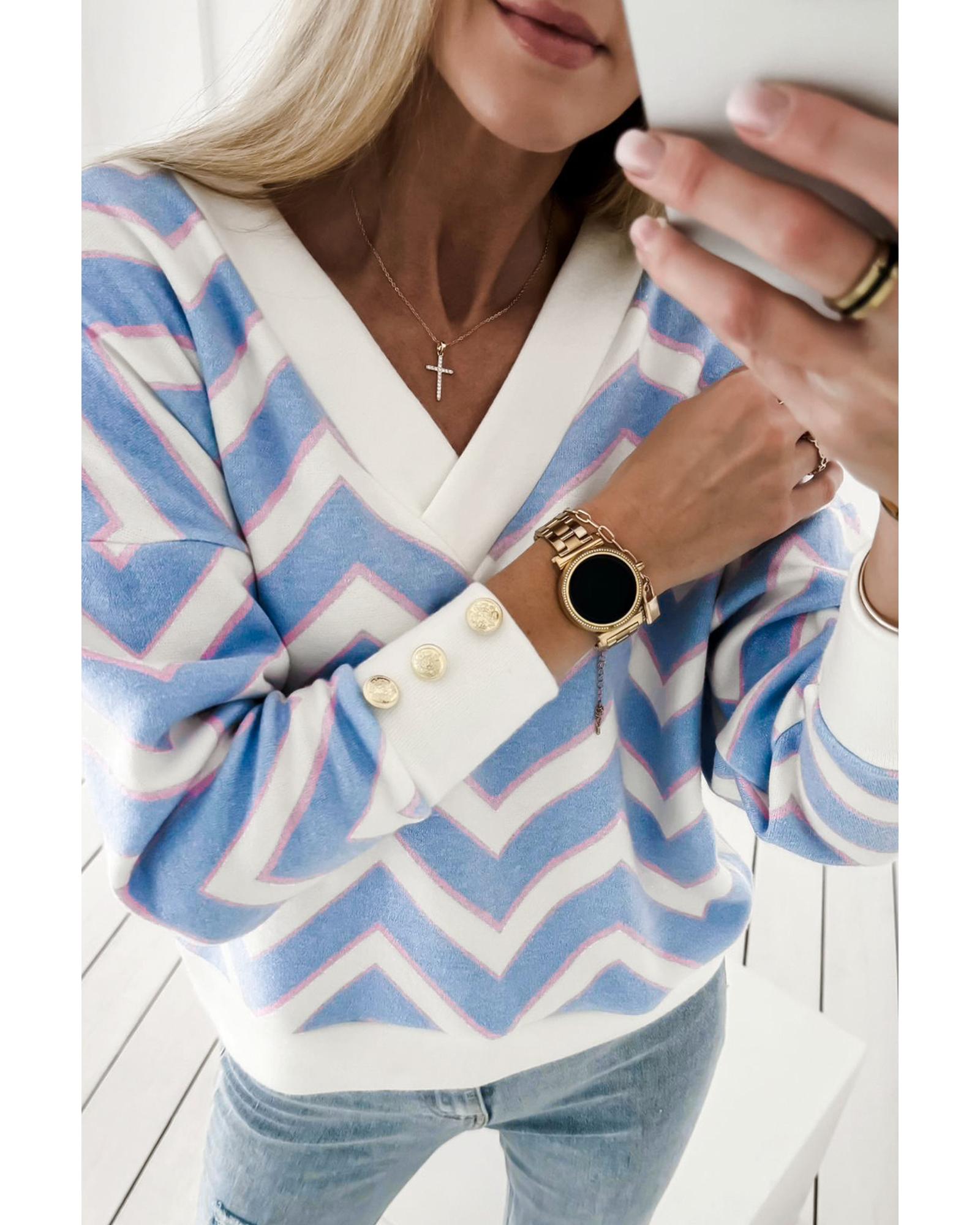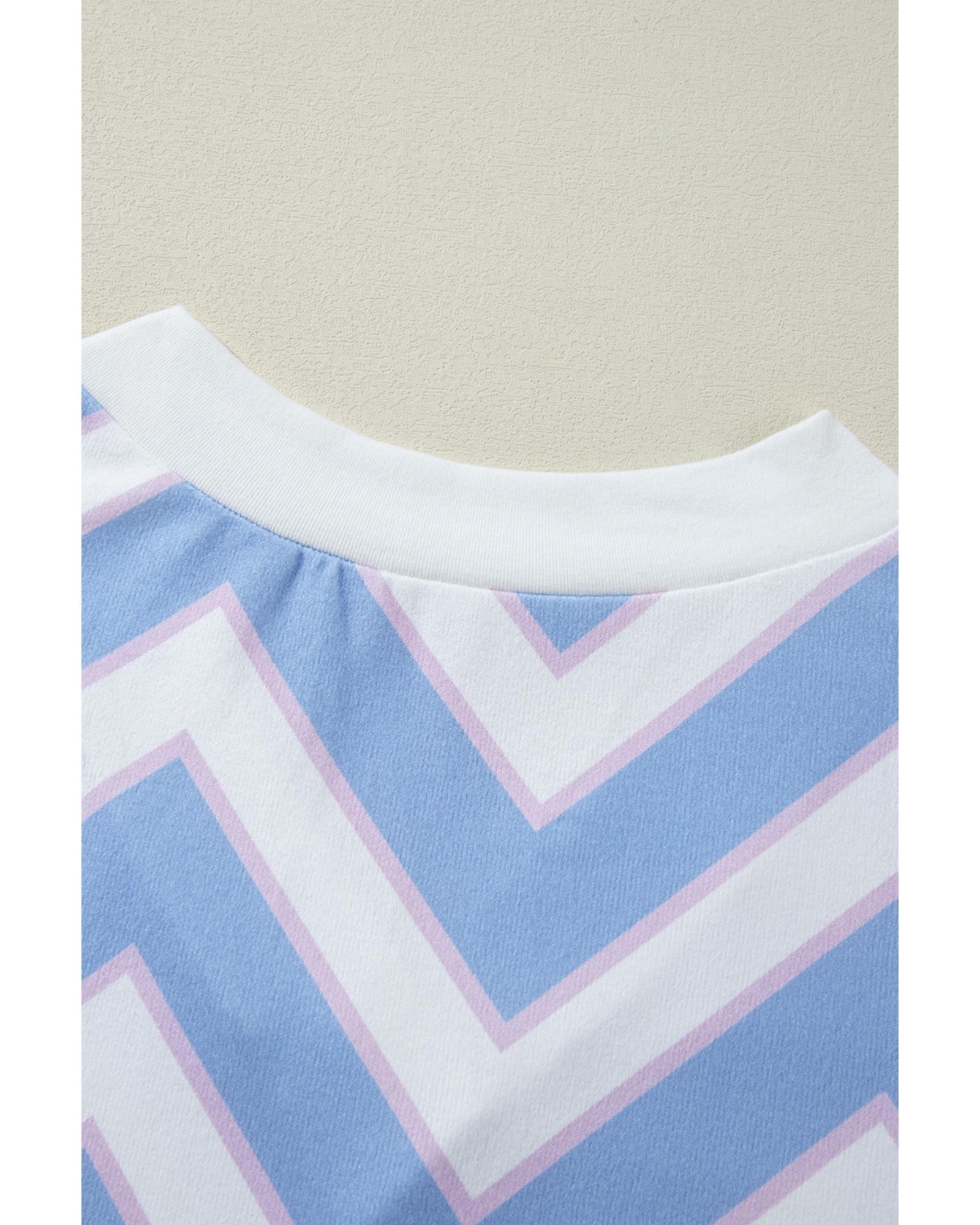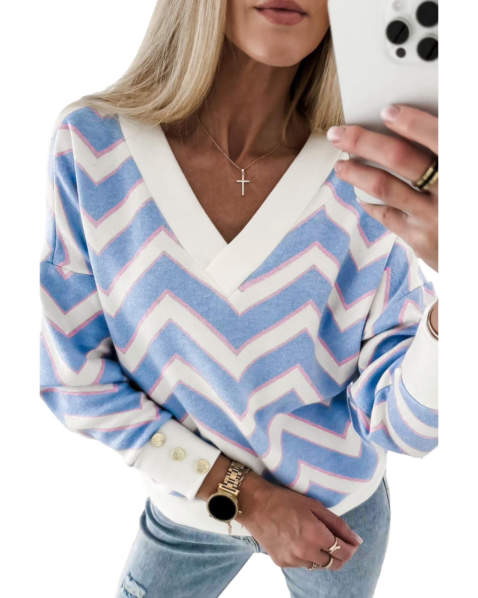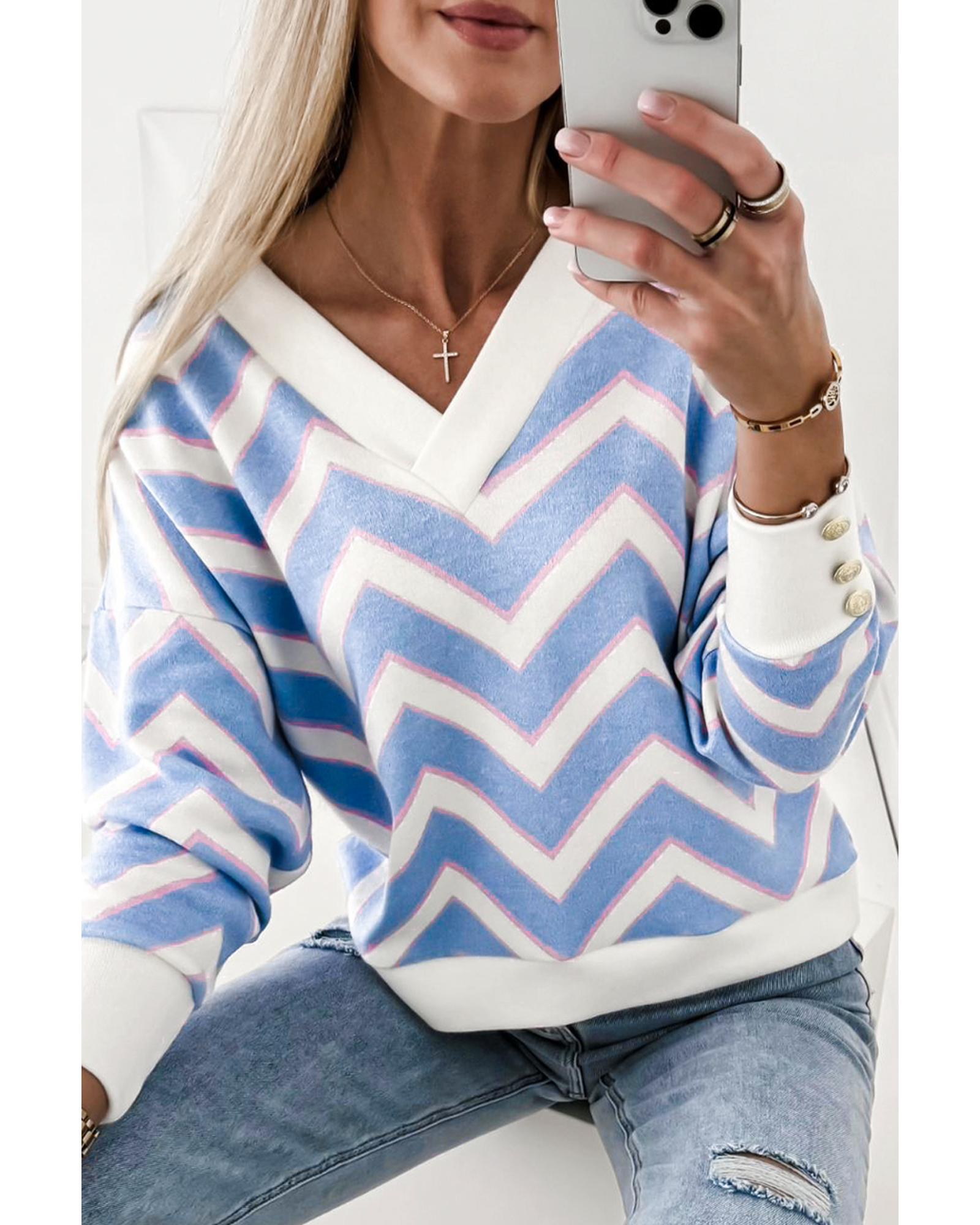 Sky Blue Zigzag Striped Print V Neck Oversized Top – S