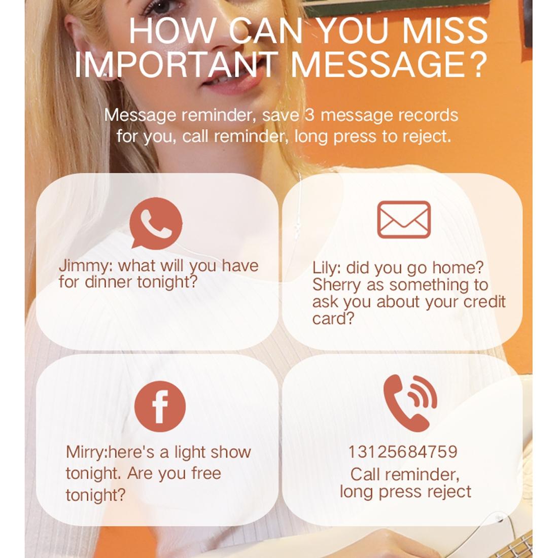 • Call, SMS, QQ, WeChat, Skype, Facebook, and WhatsApp reminders (stores up to 3 message records)