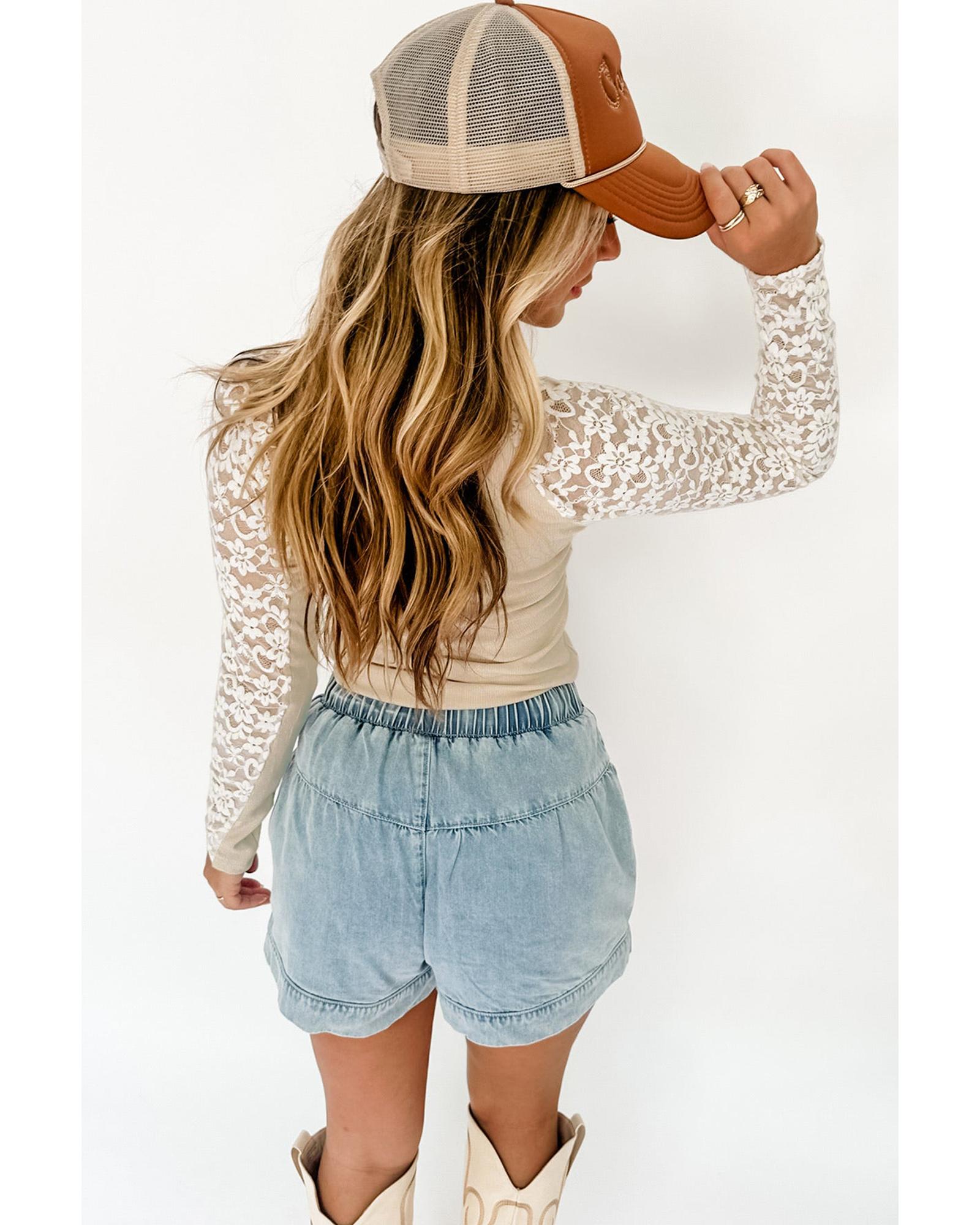 Smoke Gray Floral Lace Patchwork Long Sleeve High Neck Slim Top – S
