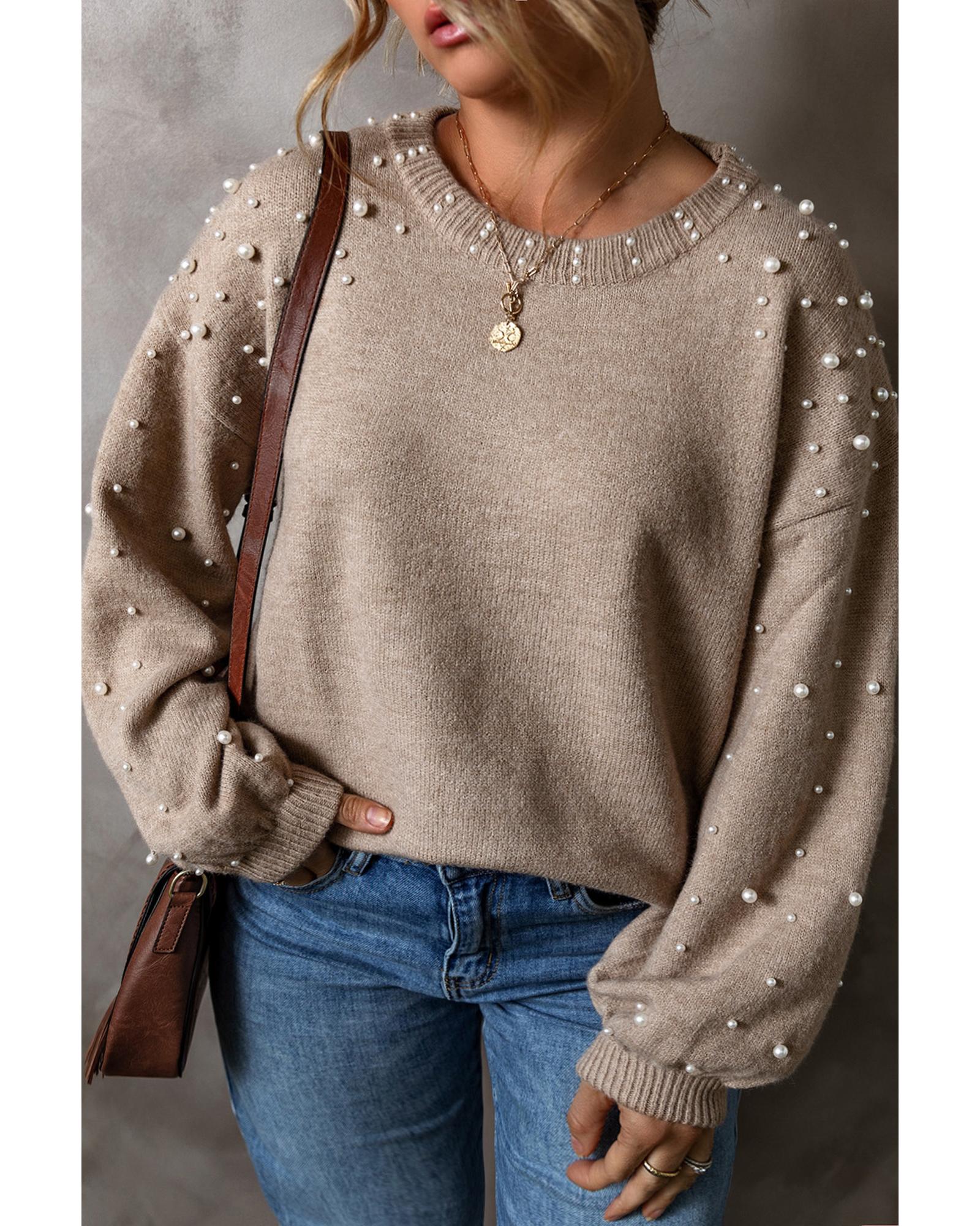 Smoke Gray Pearled Drop Shoulder Plus Size Sweater - 1X
