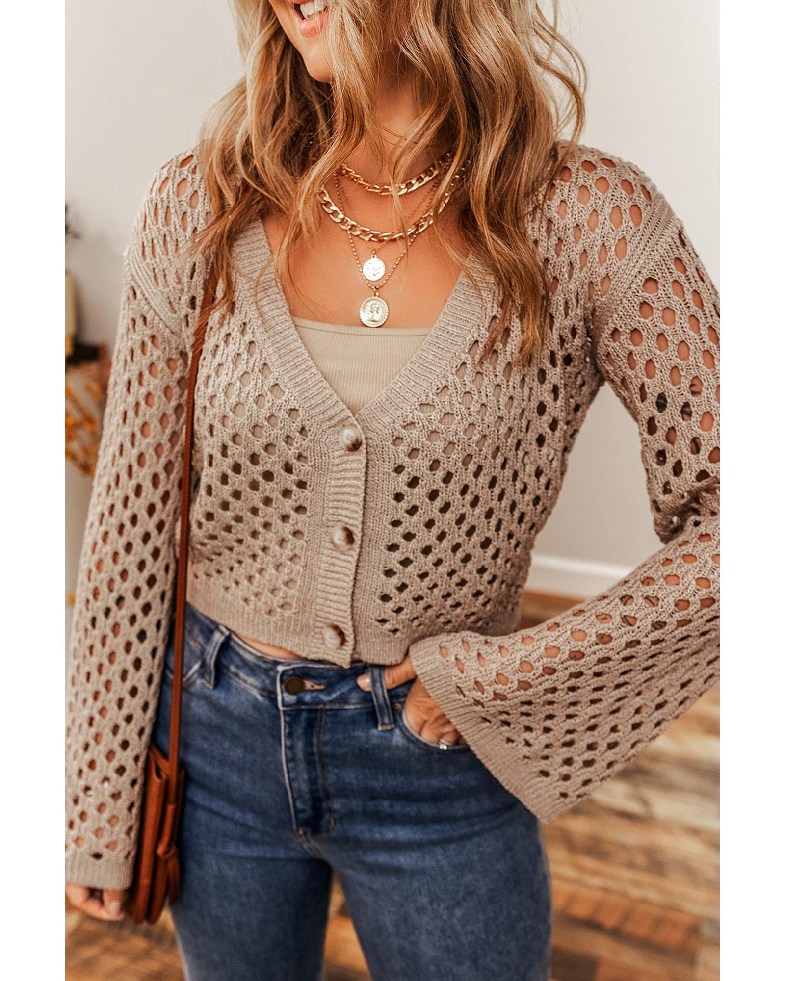 - Smoke Gray Pointelle Knit V Neck Button Up Crop Cardigan
