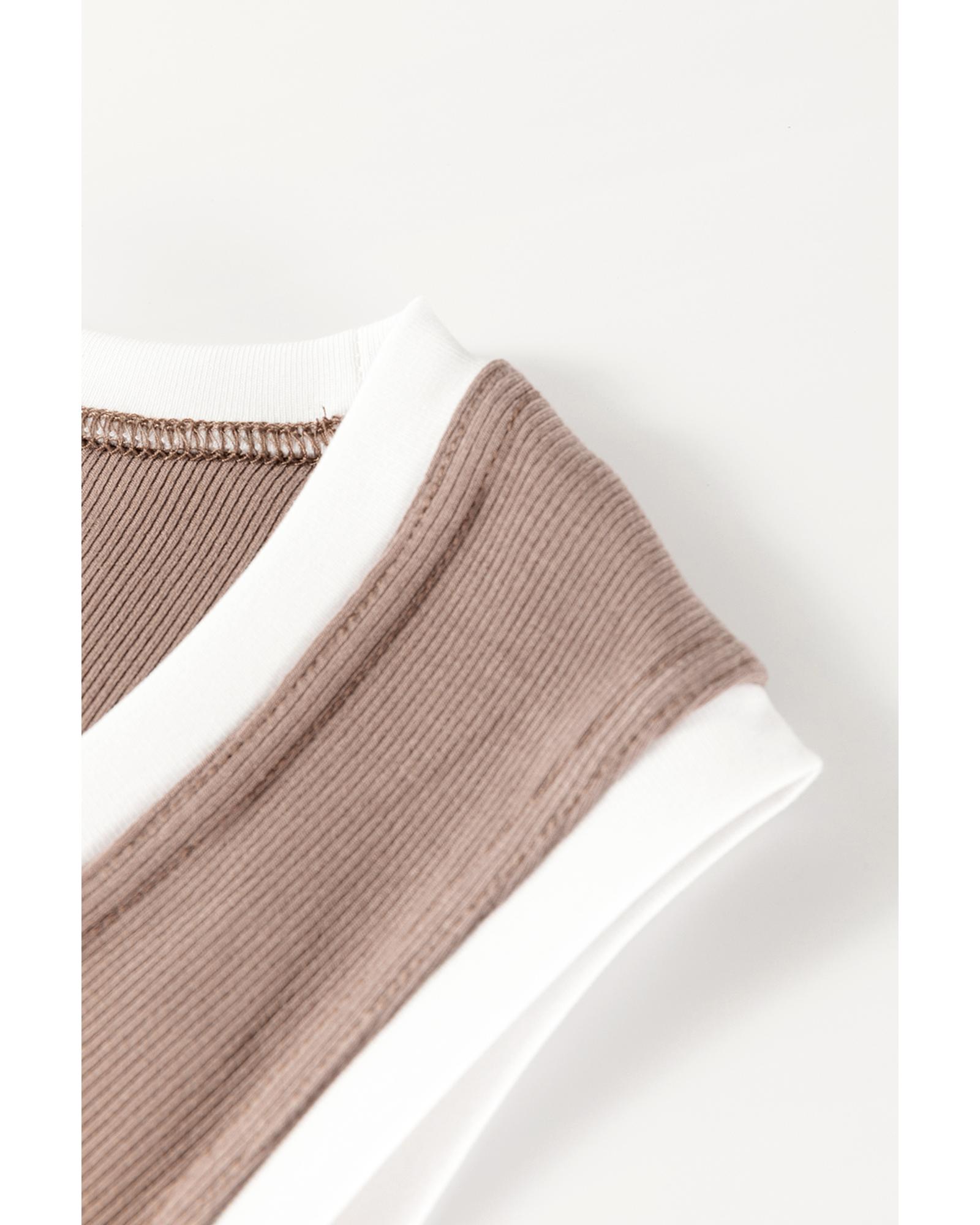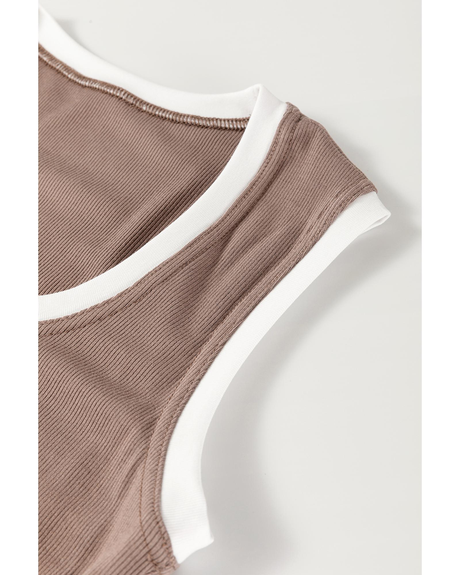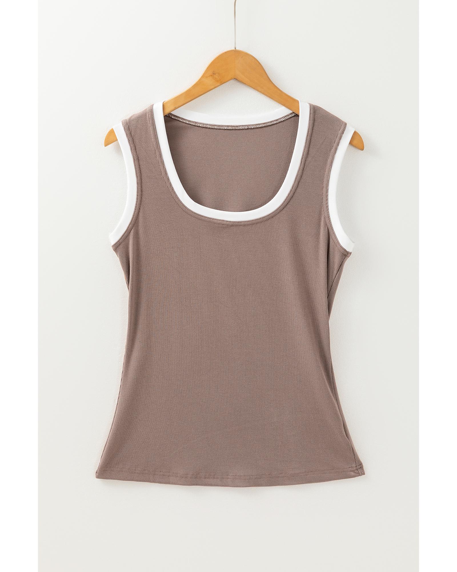 Smoke Gray Ribbed Knit Colorblock Edge U Neck Slim Fit Tank Top – L