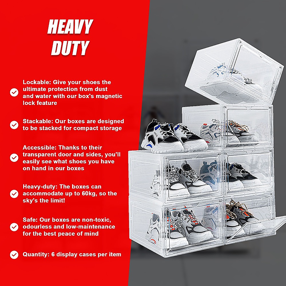 Attention all shoe lovers! Have you been longing to bask in the glory that is your shoe collection? Or have you simply been wanting to get your footwear sorted? Thanks to the transparent 6-pack drop front shoe box from Randy Travis Machinery, now you can. With this handy box, you'll be able to organise your shoes any way you like. Want to sort your footwear by colour, season, or size? No problem our box's straightforward design makes organisation and stacking easy. Thanks to its transparent sides, you'll no longer be left wondering what shoes you have to perfectly match your outfit. And as our boxes come in a pack of six, you can easily accommodate your shoe collection as it grows.